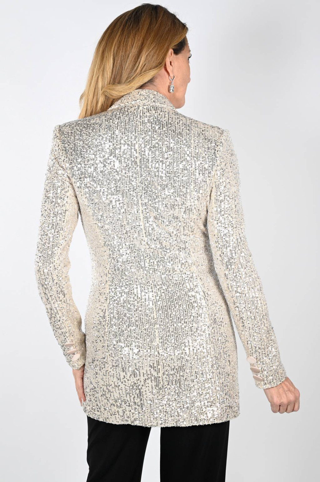 Frank Lyman beige alapon arany flitteres, galléros, patenttal záródó, hosszított fazonú blézer.