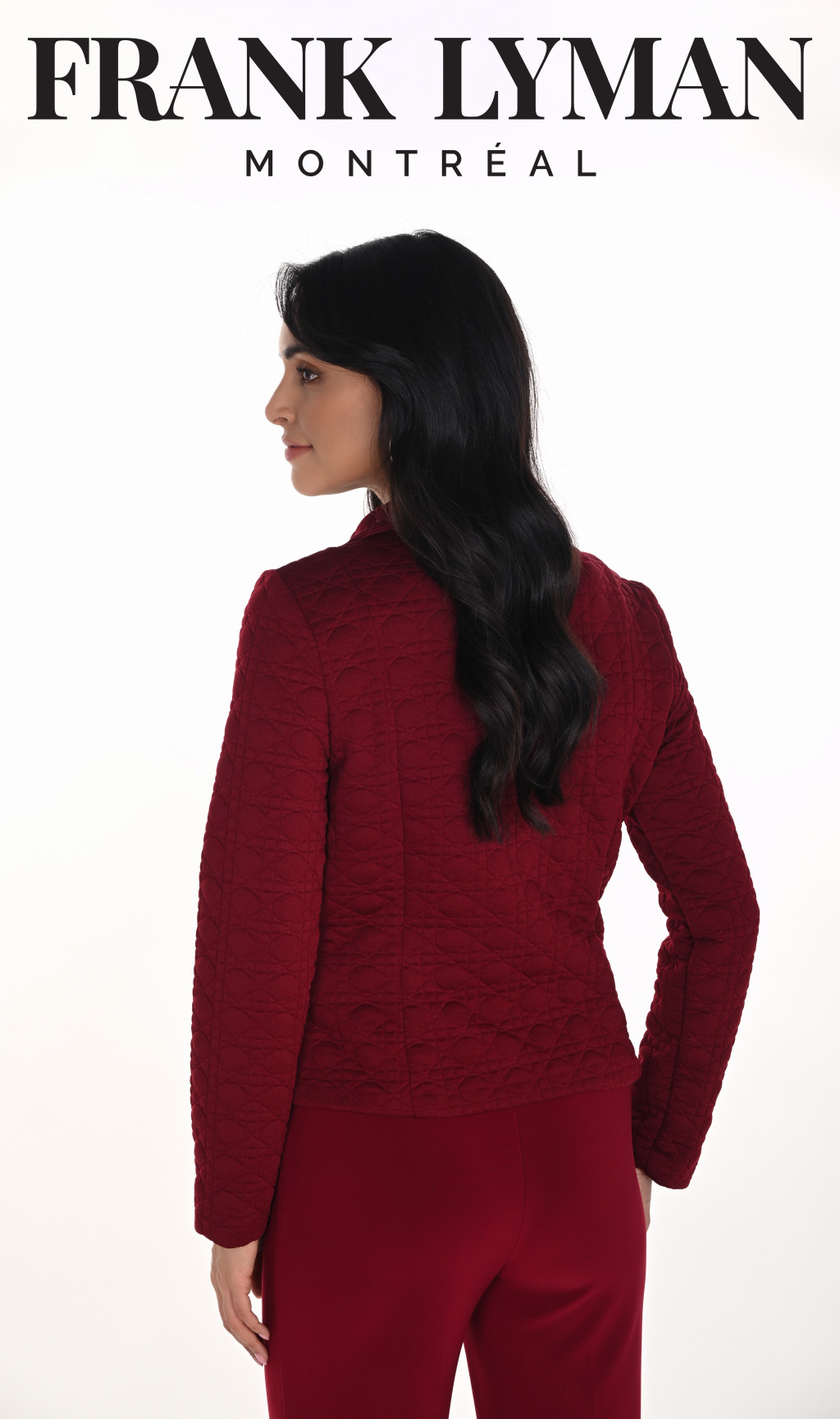 Frank Lyman bordó anyagában mintás arany zippes blézer.