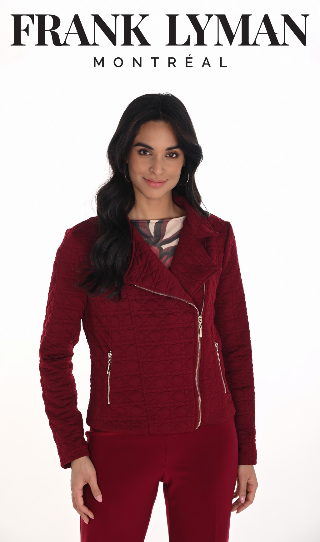 Frank Lyman bordó anyagában mintás arany zippes blézer.