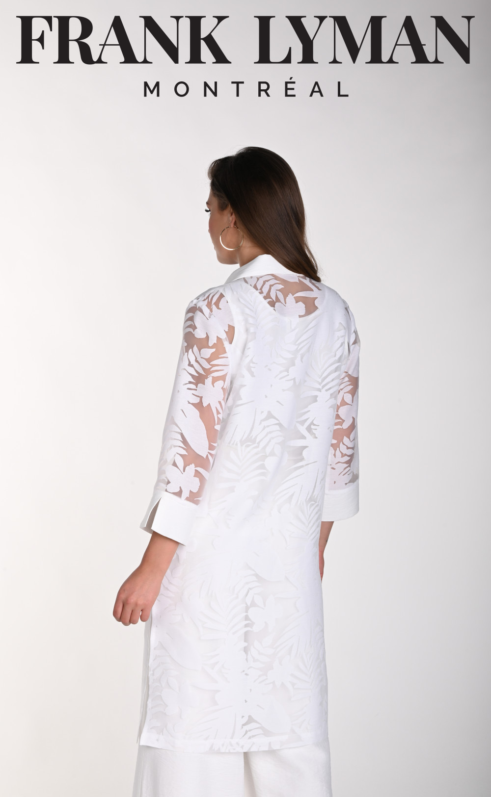 Frank Lyman ekrü színű, áttetsző és anyagában mintás, galléros, elején gombos, kétoldalt sliccelt, hosszított, egyenes fazonú ingtunika.