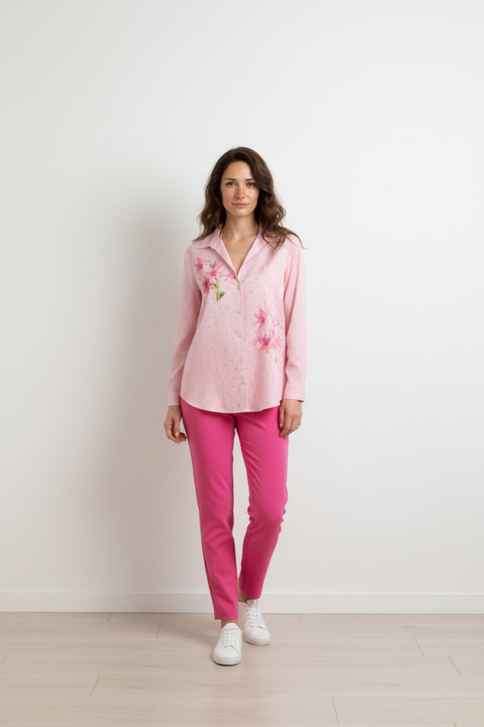 Frank Lyman fehér-rózsaszín csíkos elején köves virágmintás gombos galléros ing.