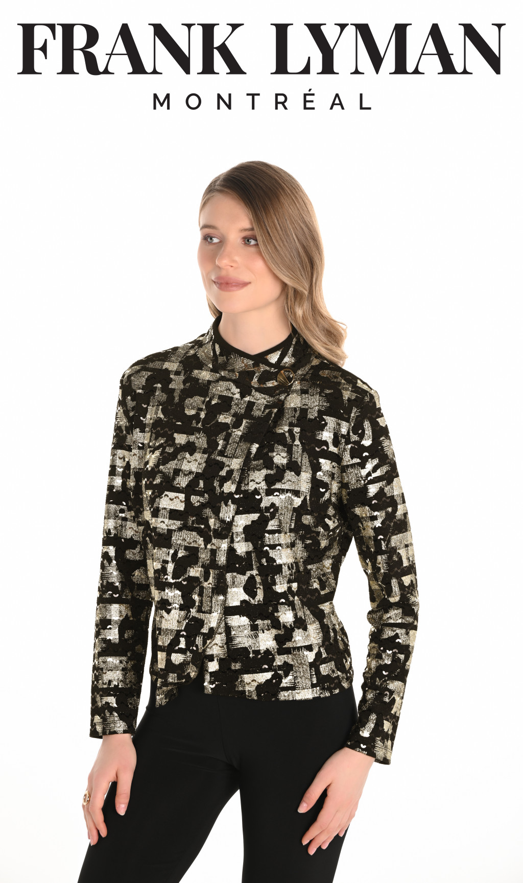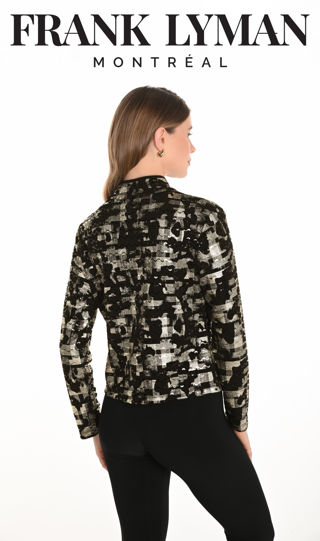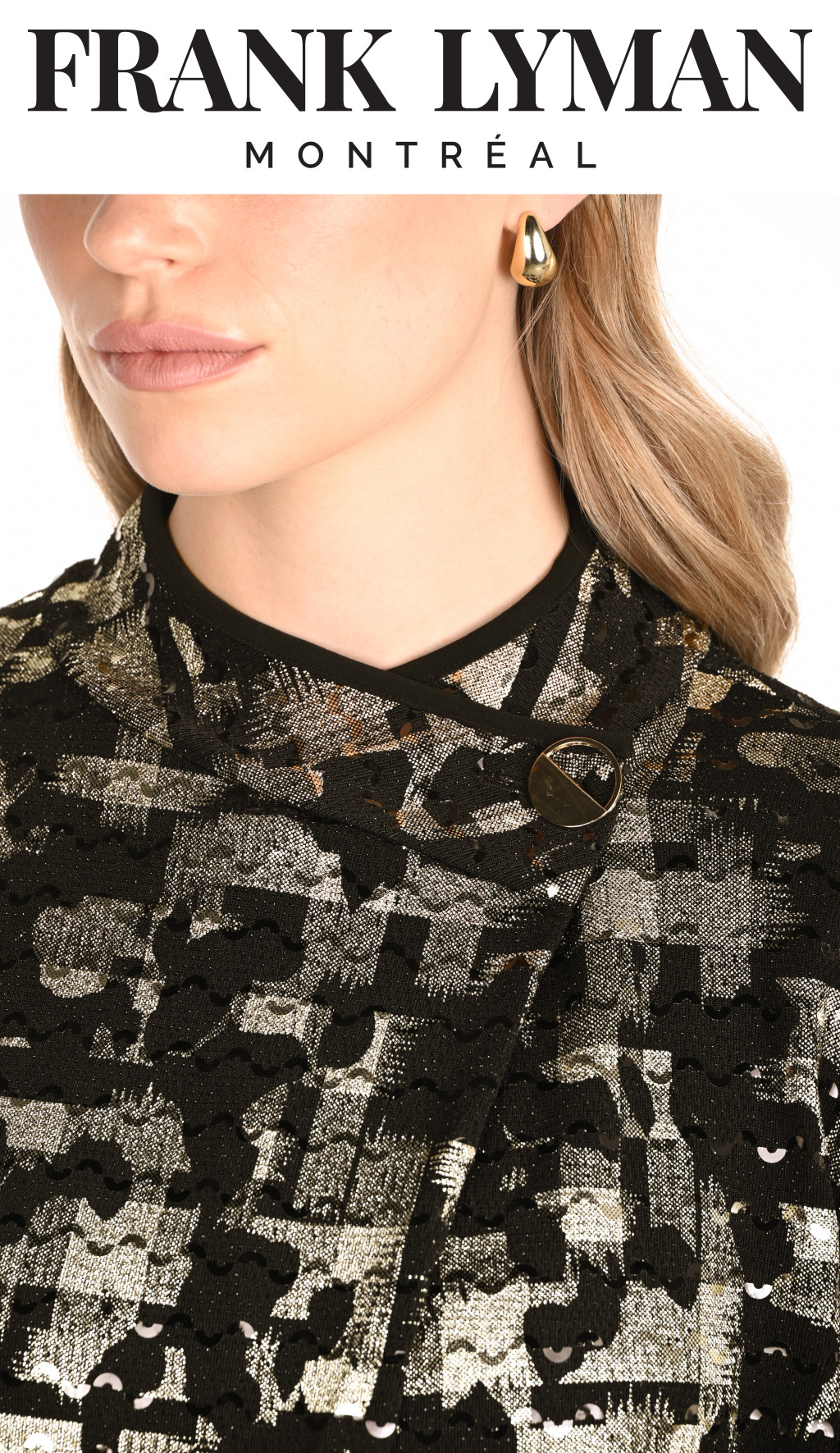 Frank Lyman fekete alapon arany és flitteres nyakán egy gombos blézerke.
