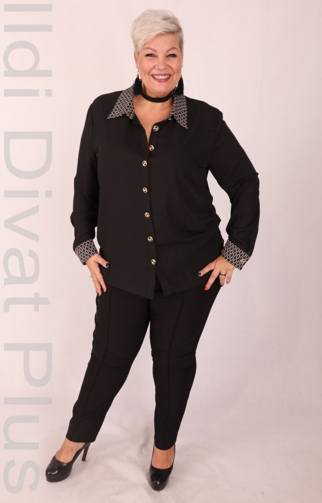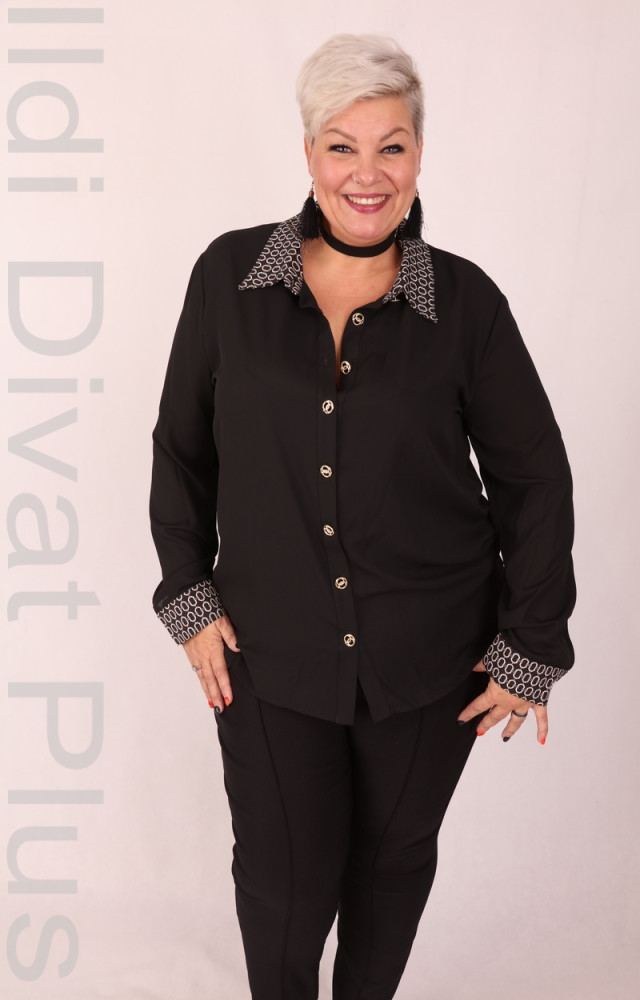 Frank Lyman fekete színű, gallérján és ujja végén beige mintás, elején arany gombos, egyenes fazonú ing.