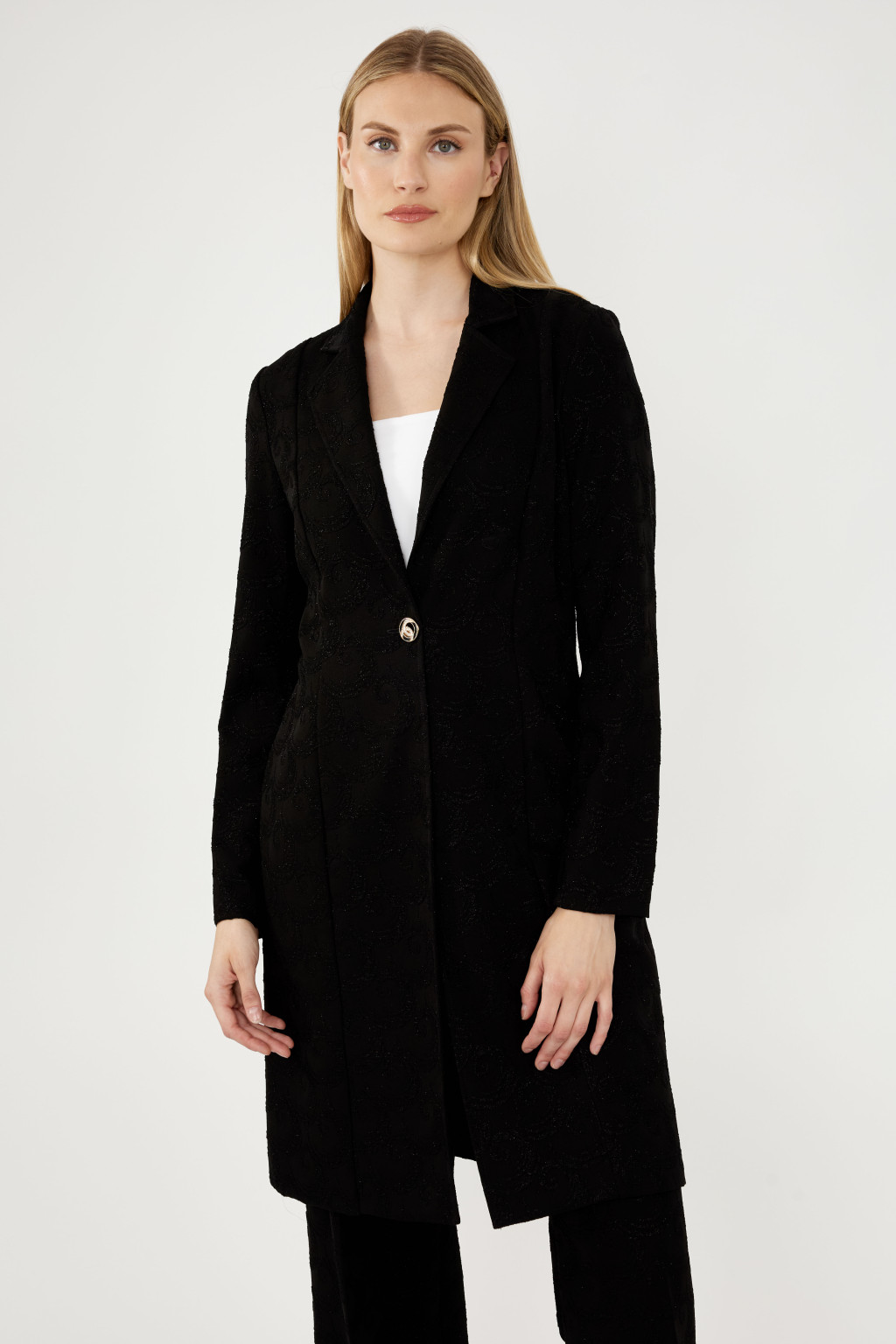 Frank Lyman fekete anyagában mintás csillogós egy gombos hosszított blézer.