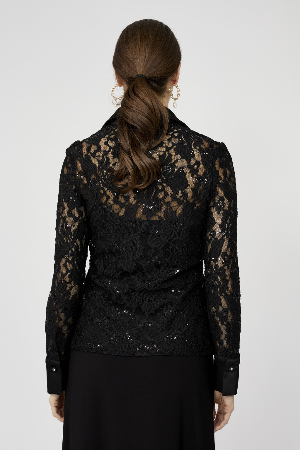 Frank Lyman fekete alapon csipkés flitteres gombos galléros ing.