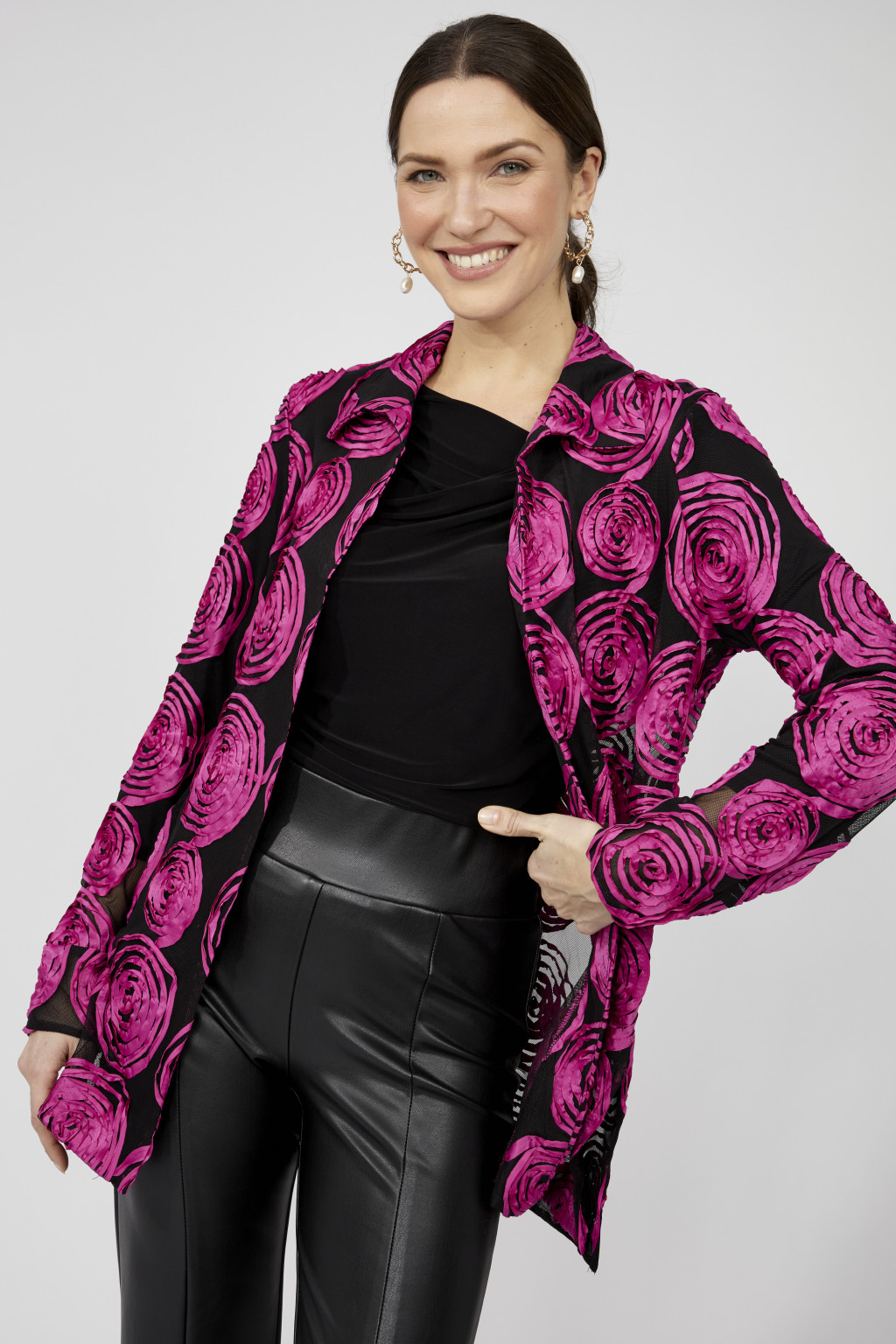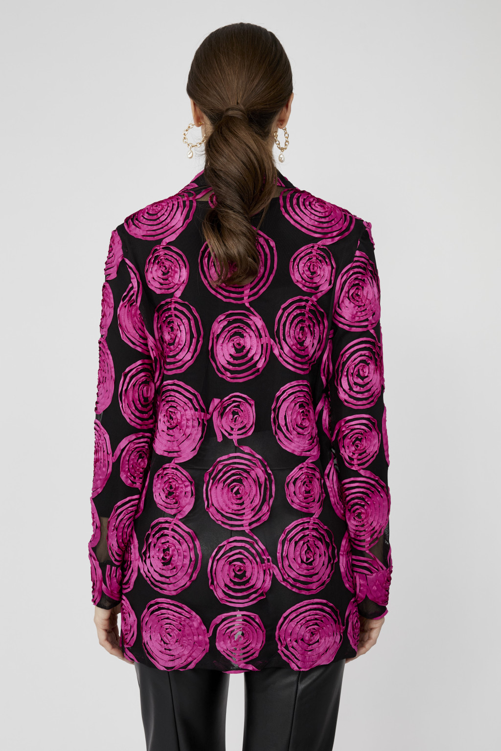 Frank Lyman fekete alapon magenta galléros 3D mintás blézer.