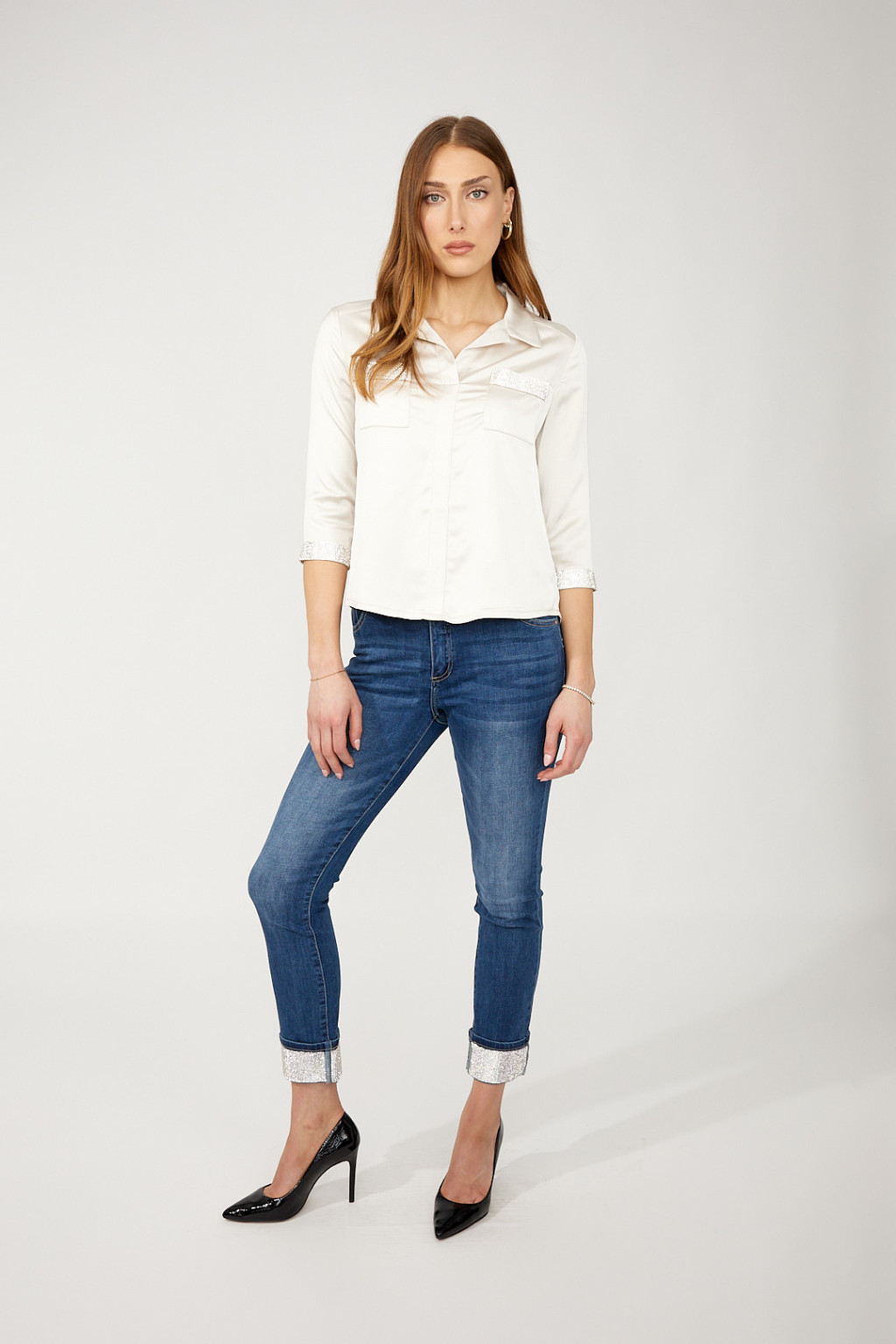 Frank Lyman pezsgő színű köves galléros V nyakú blúz.