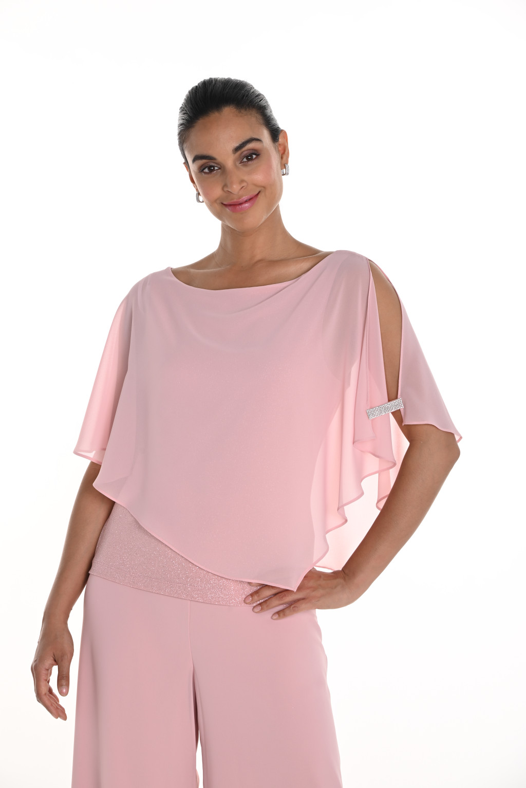 Frank Lyman púder színű, alsó része csillogós és teteje muszlin anyagú, váll résznél strassz díszítéses és nyitott, egyenes fazonú blúz.