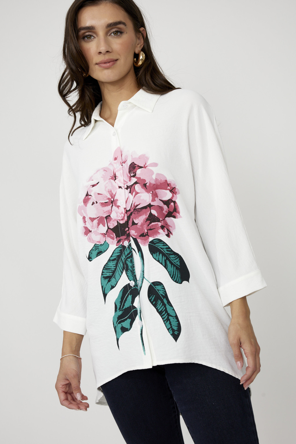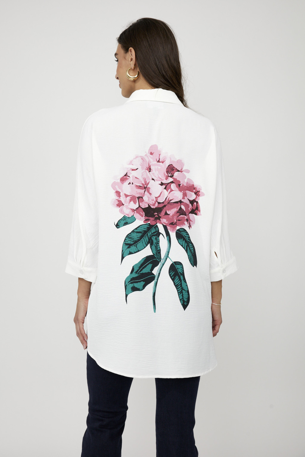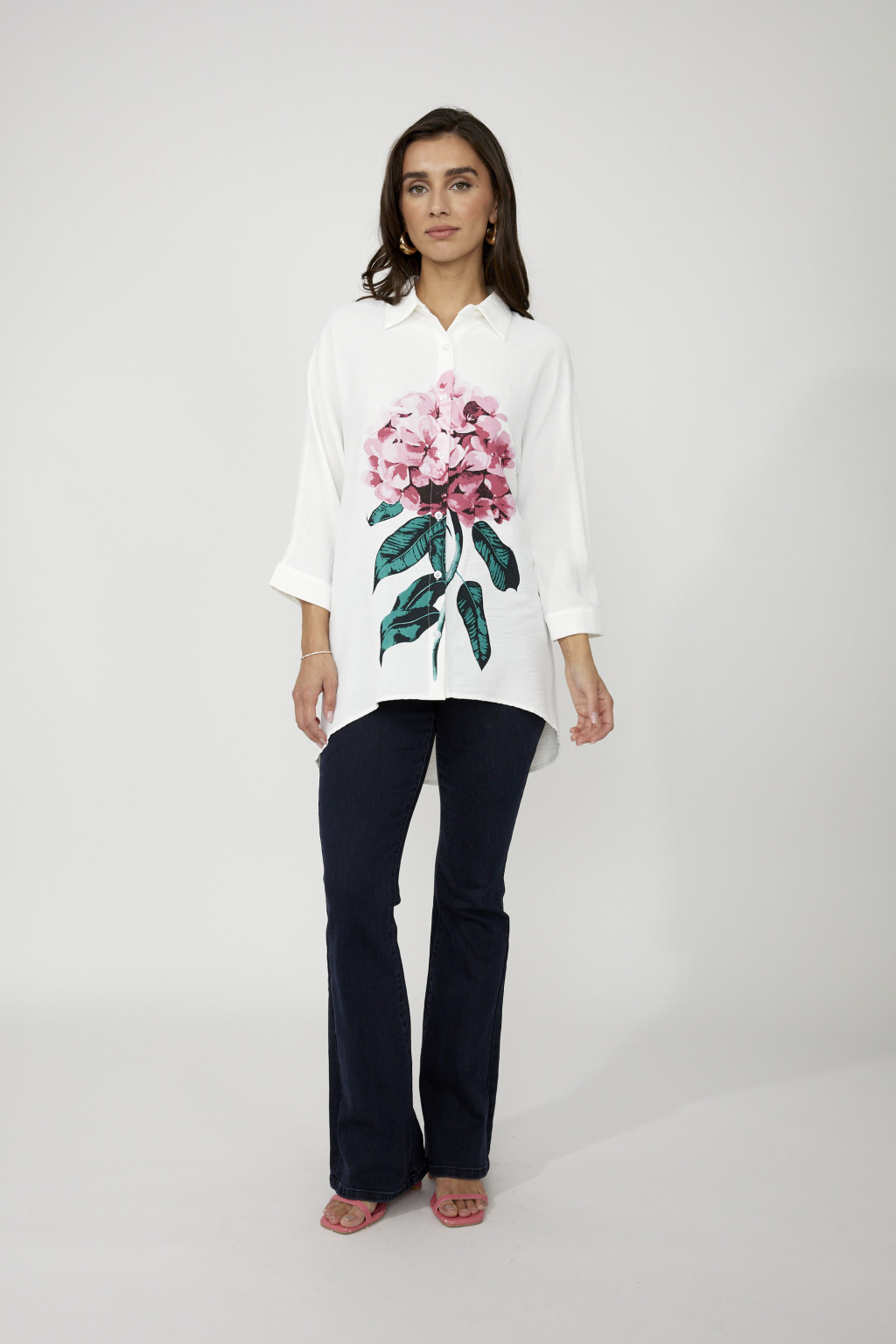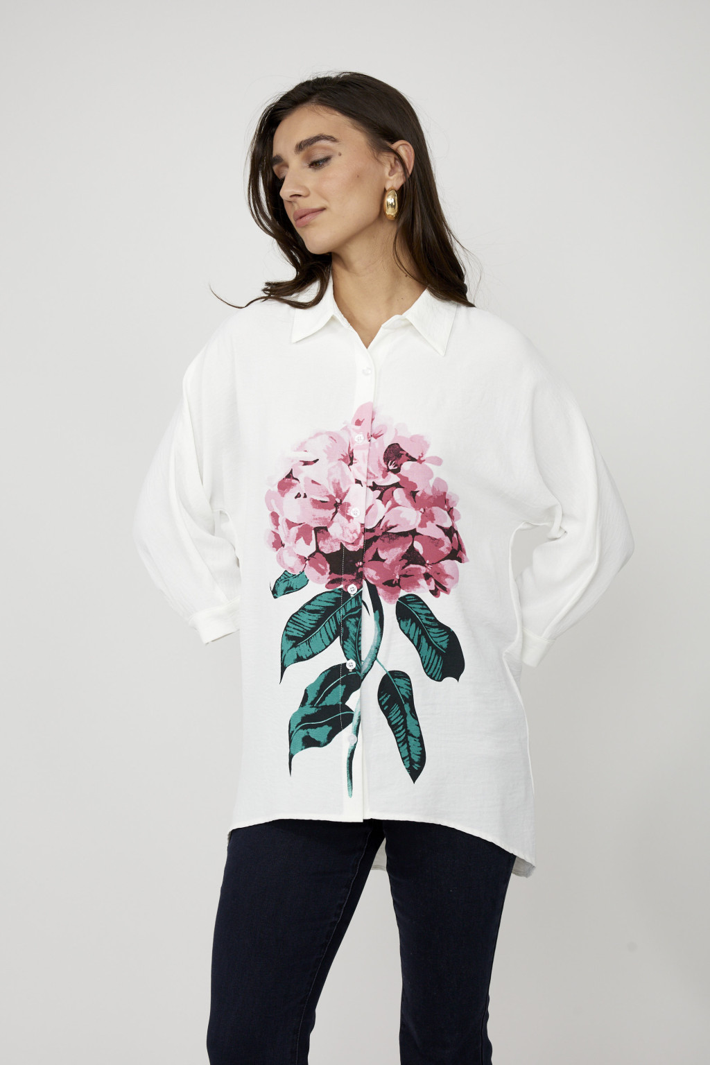 Frank Lyman ekrü alapon elől-hátul virágmintás, galléros, gombos, egyenes fazonú ingtunika.