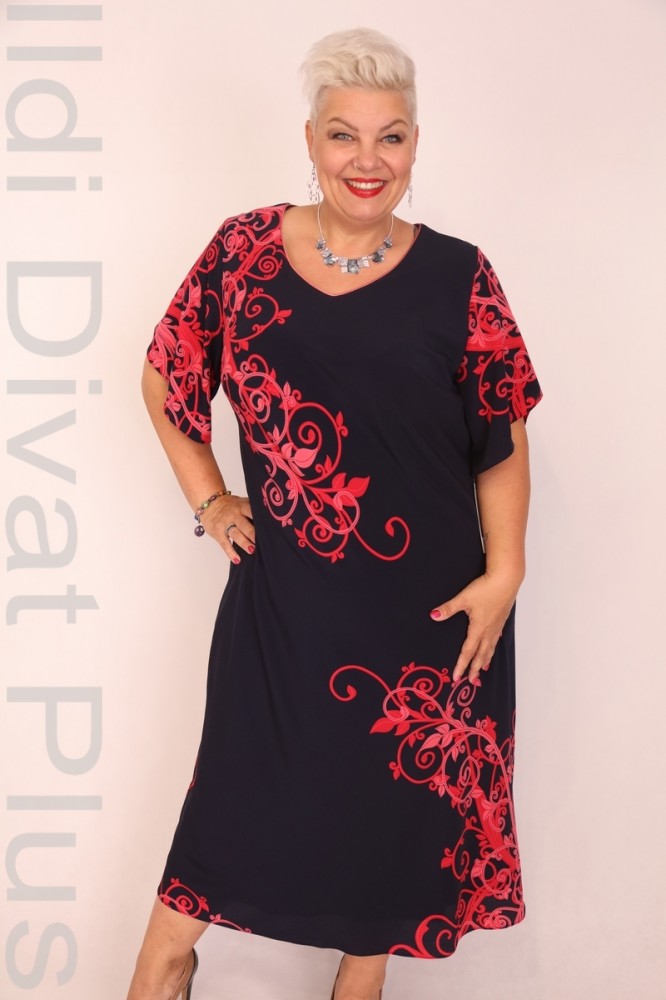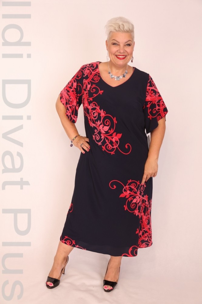 Gabriella sötétkék alapon korall virágmintás, V-kivágott, enyhén lefelé bővülő fazonú ruha.