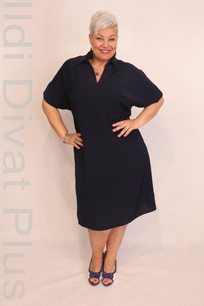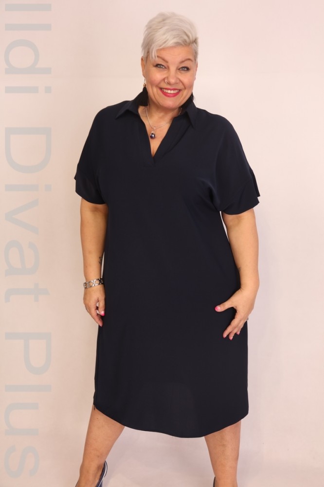 Gemko kék színű, V-kivágott, galléros, egyenes fazonú ruha.