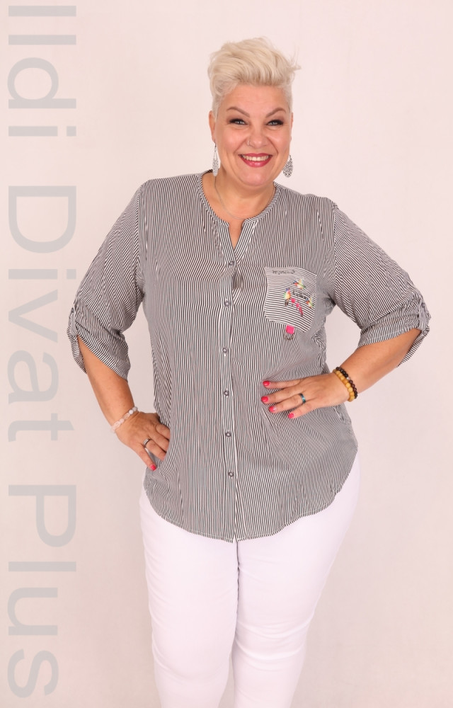 Grandi fekete-fehér csíkos, gombos, galléros, zsebes, lezser fazonú felső.