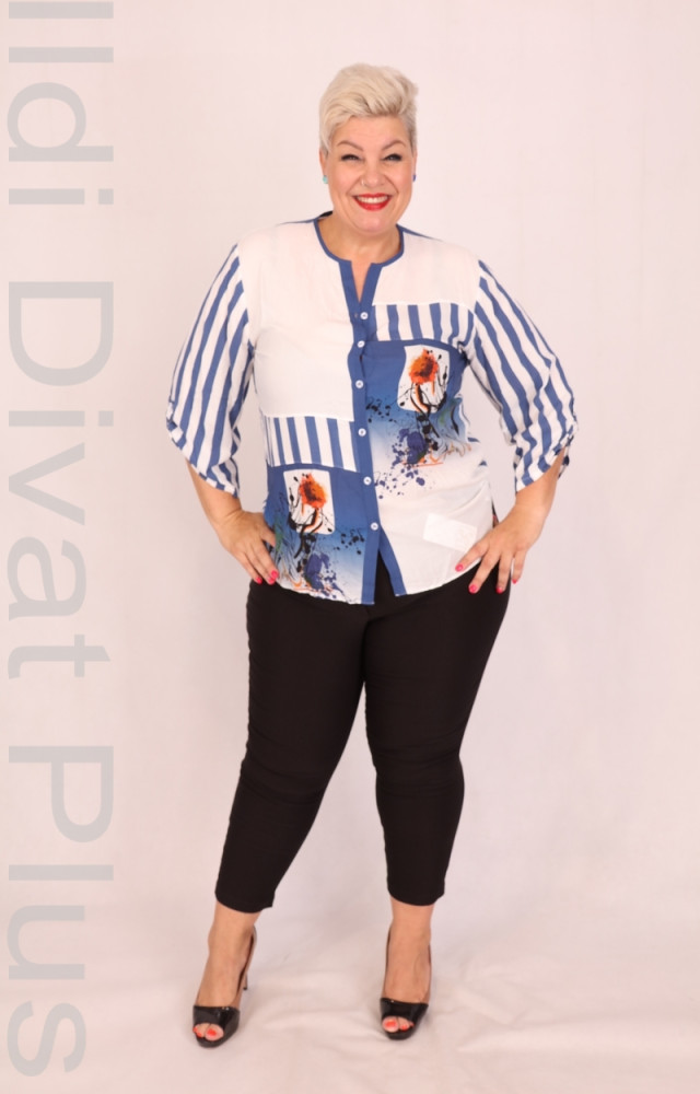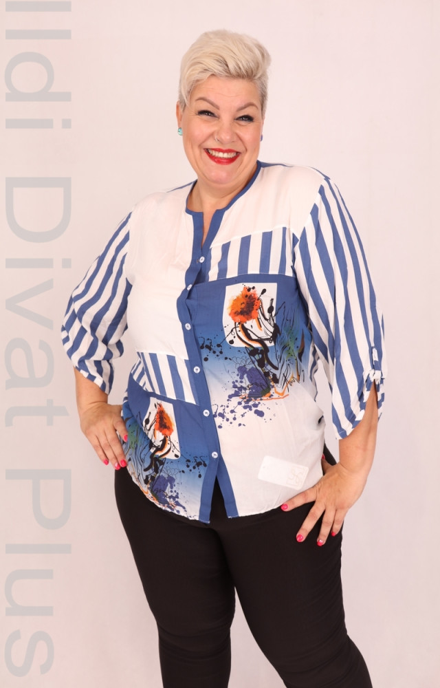 Grandi fehér-kék csíkos, gombos, galléros, lezser fazonú felső.