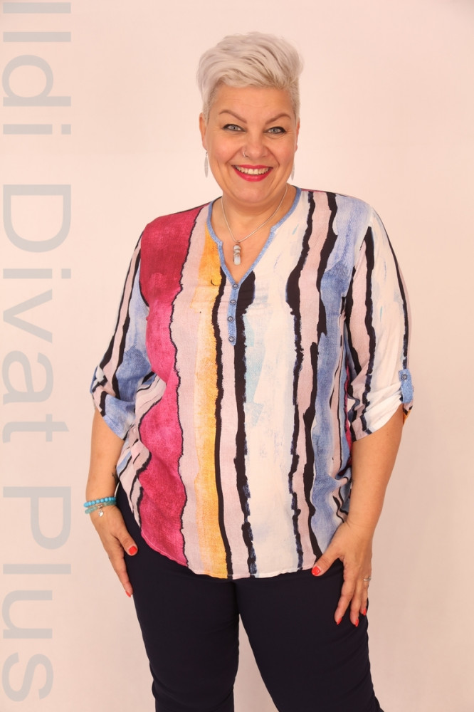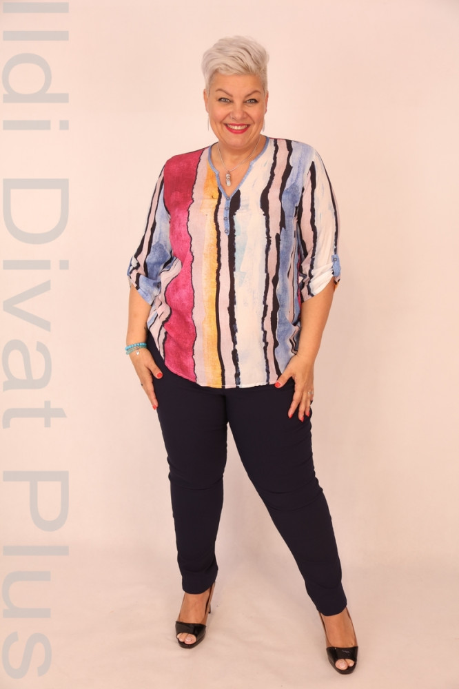 Grandi színes virágmintás, V-kivágott, gombos, lezser fazonú felső.
