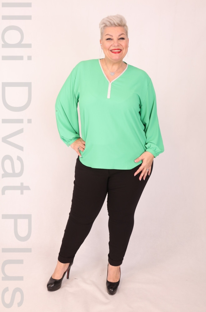 Grandi zöld színű, V-kivágott, buggyos ujjú, lezser fazonú blúz.