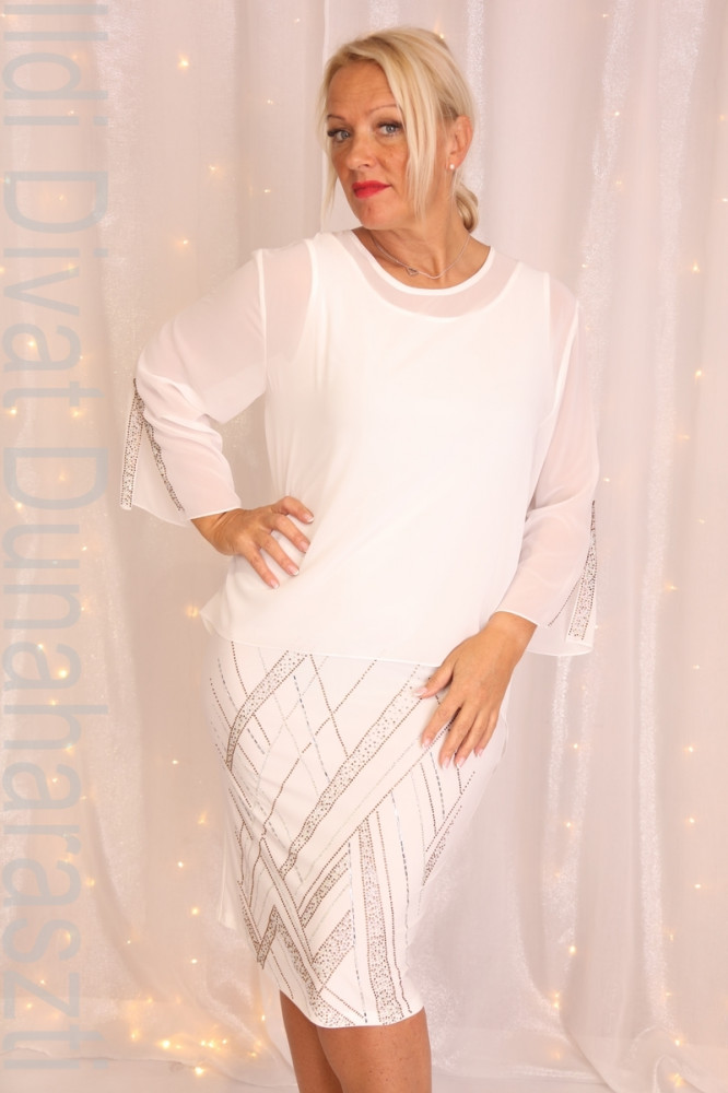 Halisdogán fehér színű, muszlin anyagú, felső részén lezser fazonú, alsó részén karcsúsított fazonú ruha.