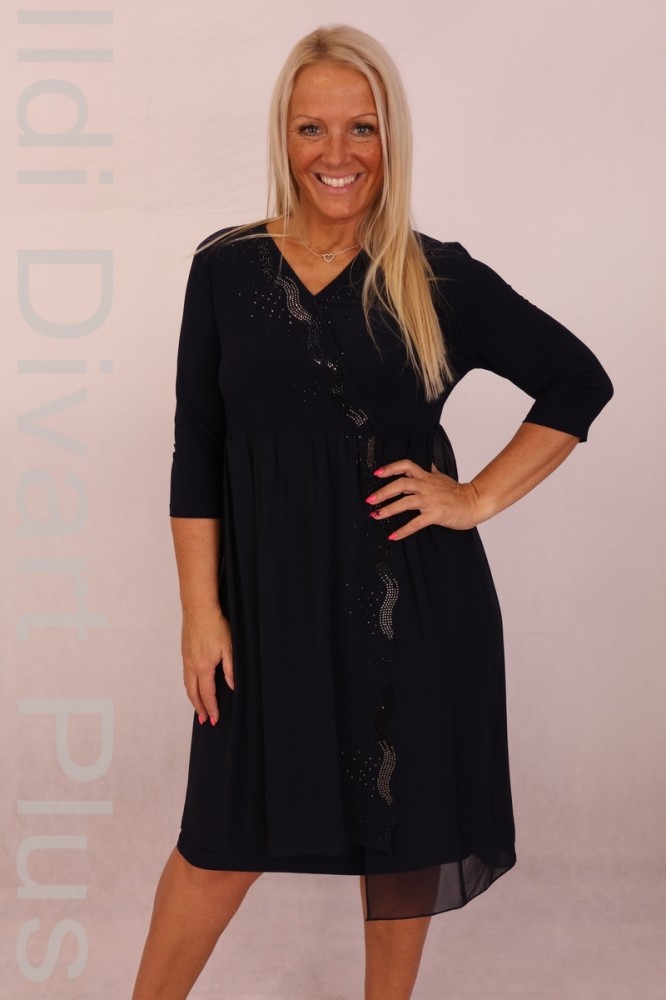 Baroslis sötétkék színű, V-kivágott, strassz díszítéses, muszlin anyagú, egyenes fazonú ruha.
