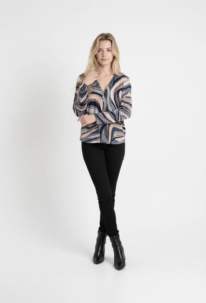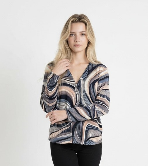 Ilona Kék-púder mintás zippes nyakú vékony kötött anyagú felső.