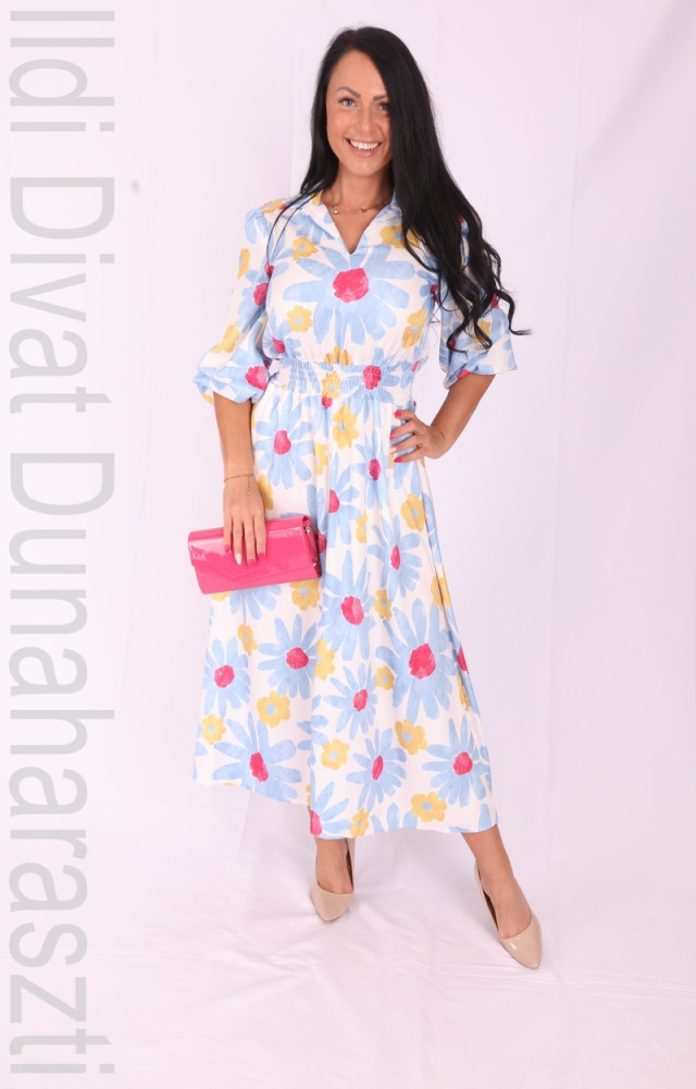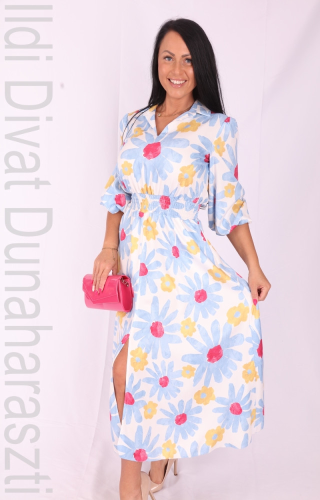 Iris fehér alapon színes virágmintás, galléros és V-kivágott, derékban és ujja végén gumírozott, zsebes, A-vonalú ruha.