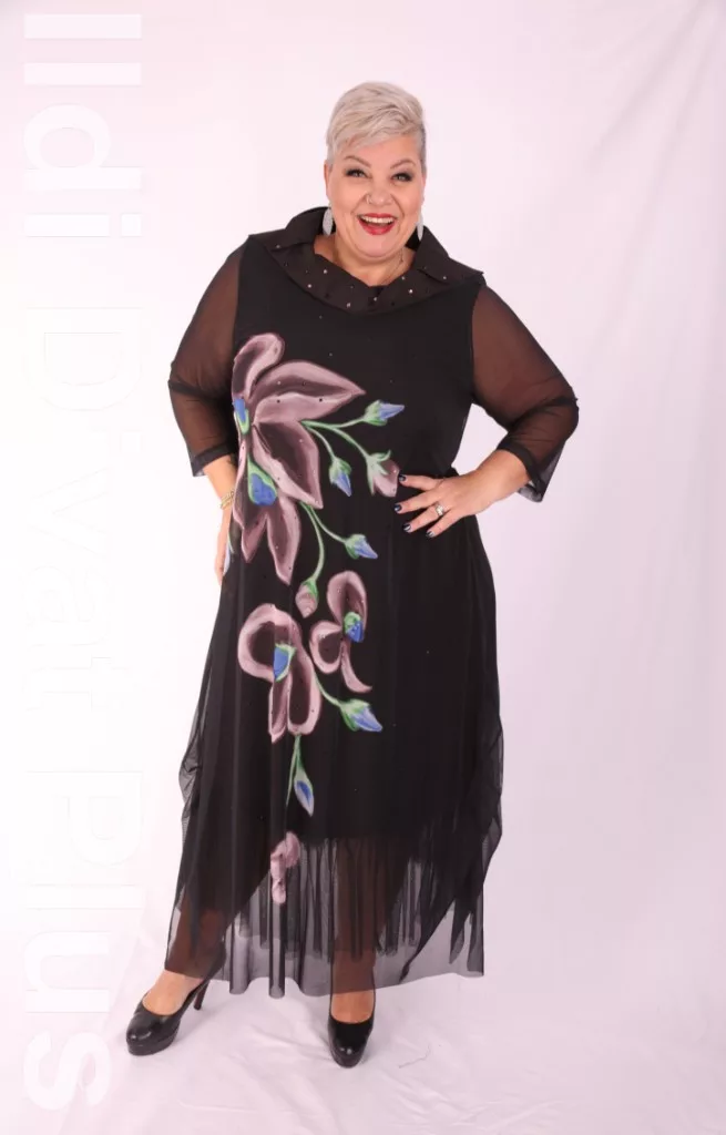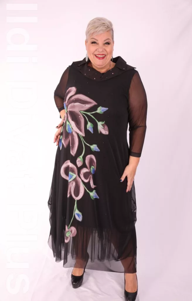 Izar fekete alapon mályva mintás köves hálós anyagú ruha.
