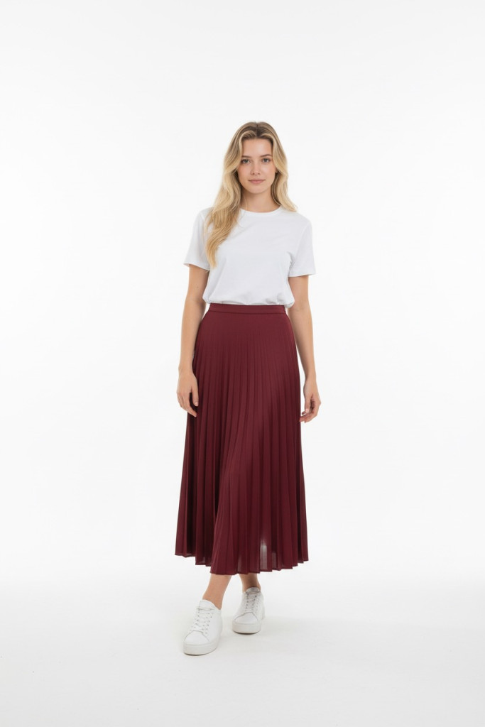 Jagoda bordó anyagában pliszírozott oldalán zippes szoknya.
