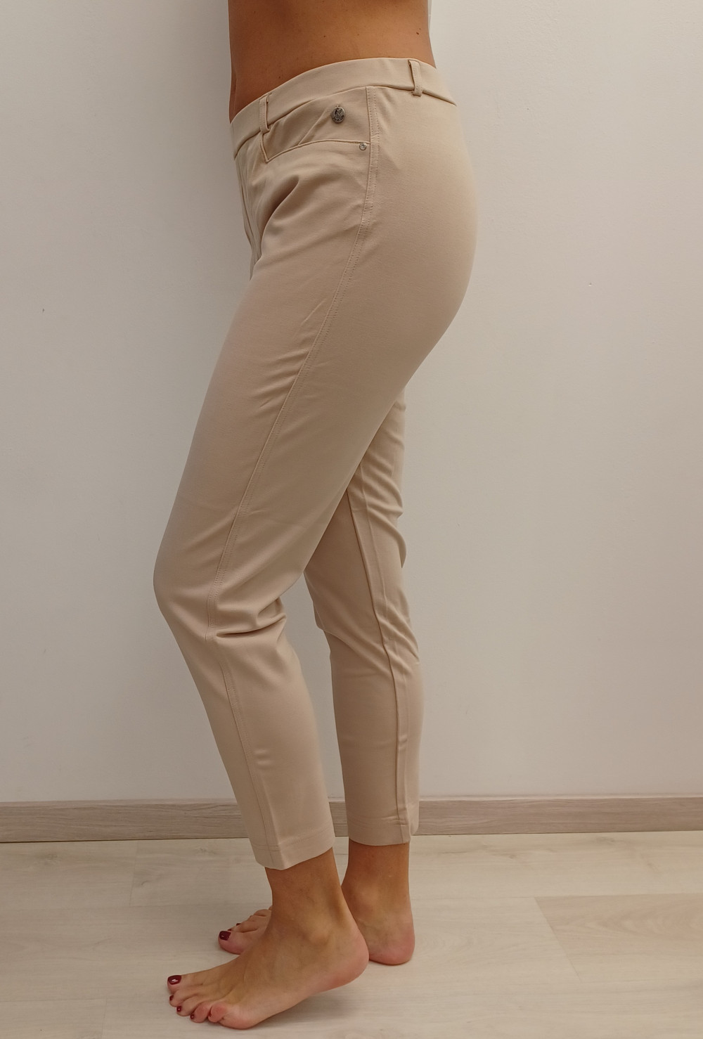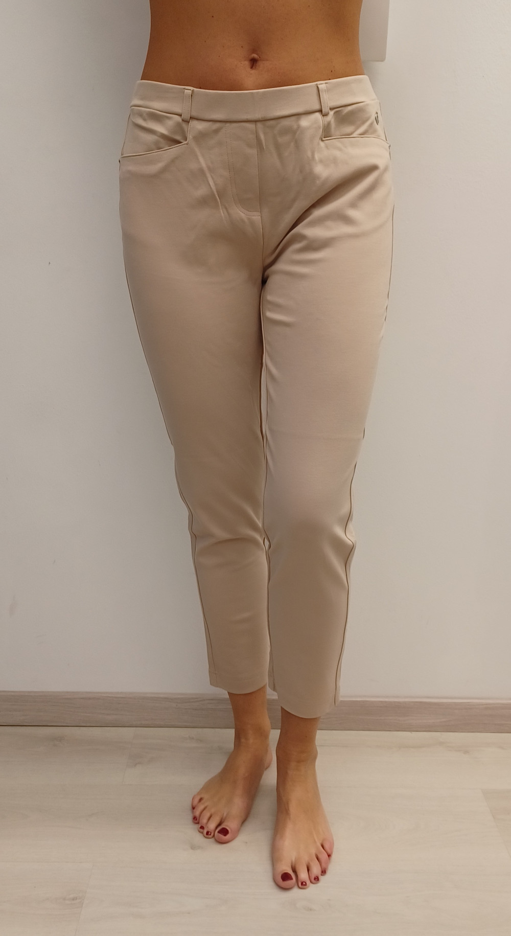 Beige színű, gumis derekú, zsebes nadrág.