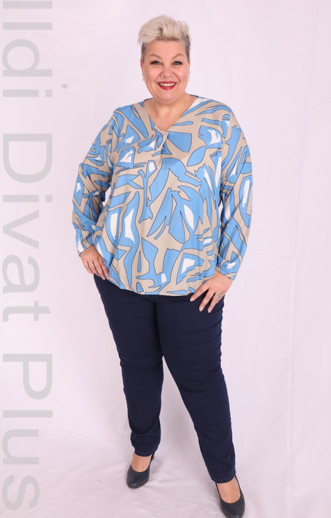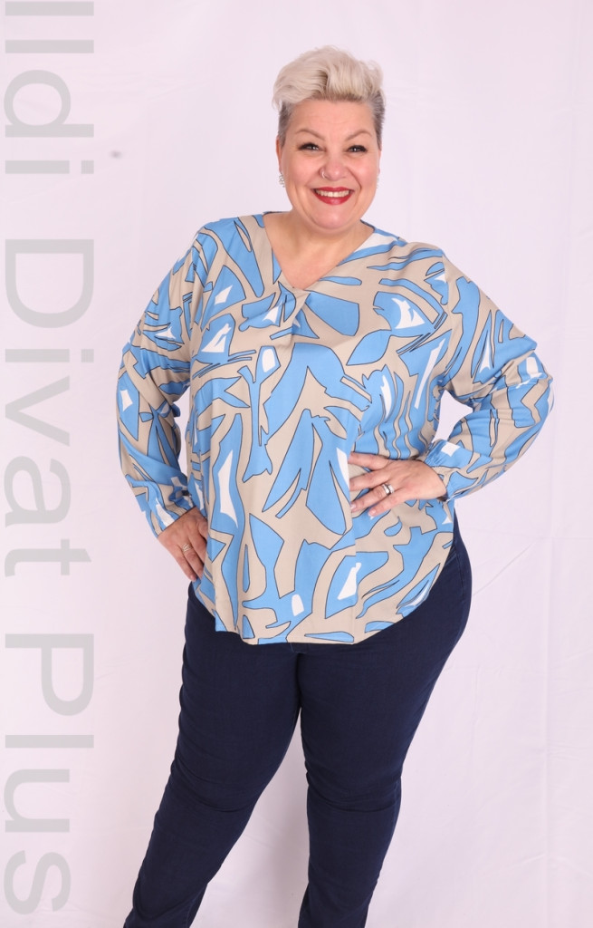 Joy Of Life kék-beige mintás v nyakú blúz.