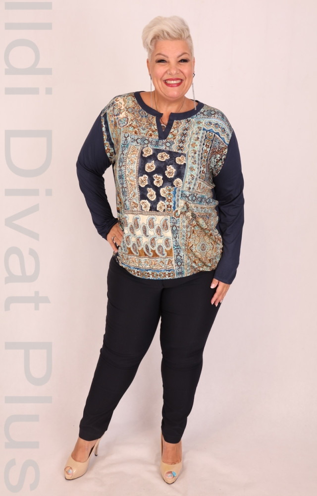 Kék-barna mintás, V-kivágott, gumis aljú felső.