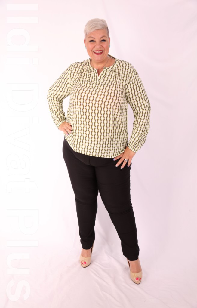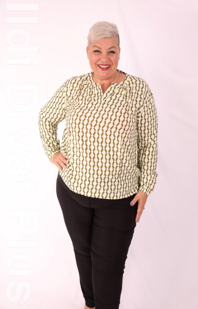 Joy Of Life zöld-keki mintás V nyakú hosszú ujjú felső.