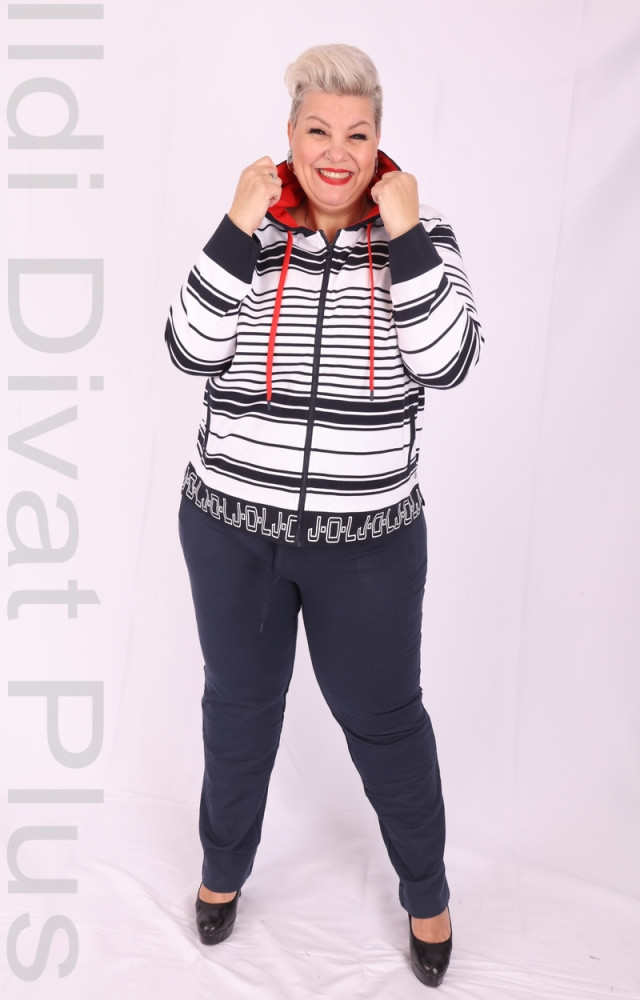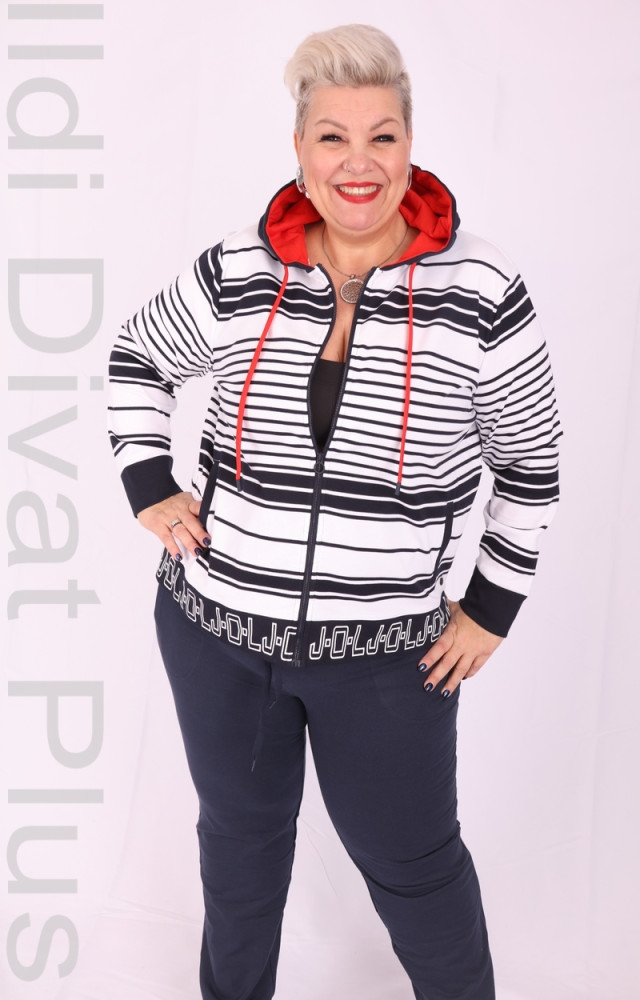Fehér alapon kék csíkos piros kapucnis zippes felső.