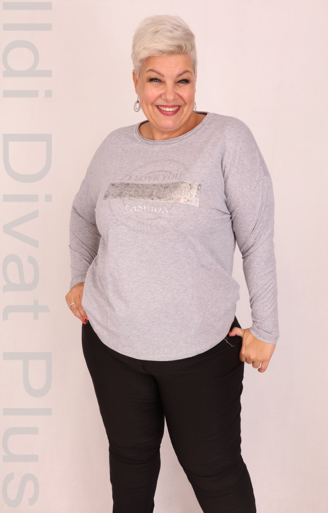 Joy Of Life szürke színű, kerek nyakú, elején mintás, lezser fazonú felső.
