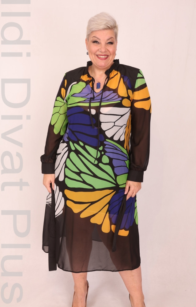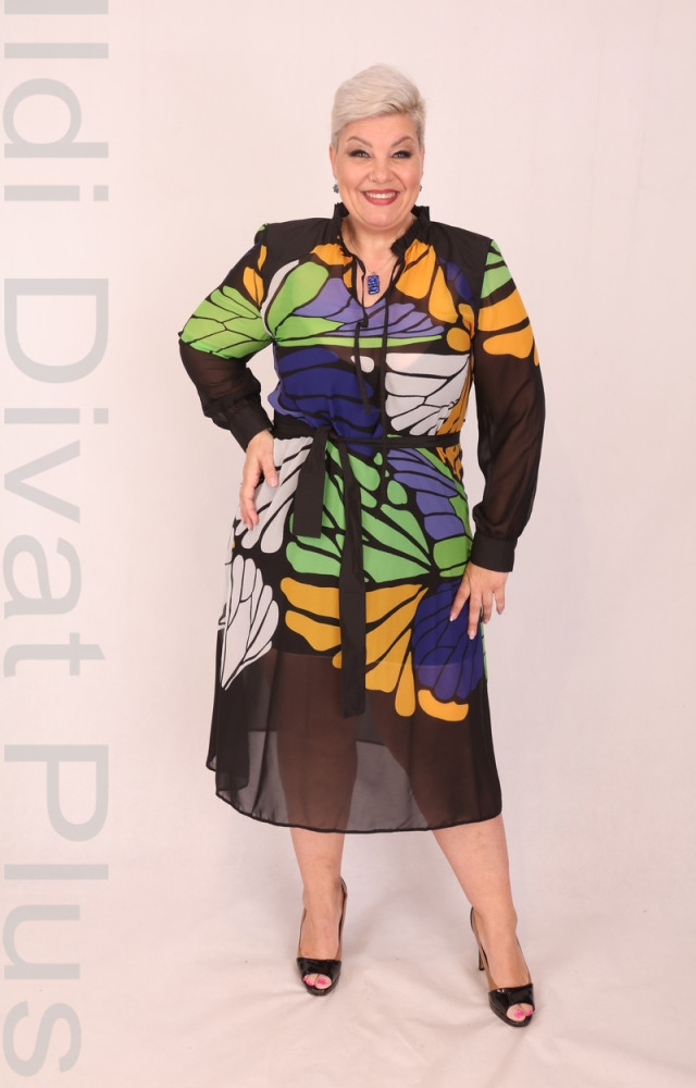Kapris fekete alapon színes mintás, V-kivágott, derekán megkötős, muszlin rátétes, enyhén lefelé bővülő ruha.
