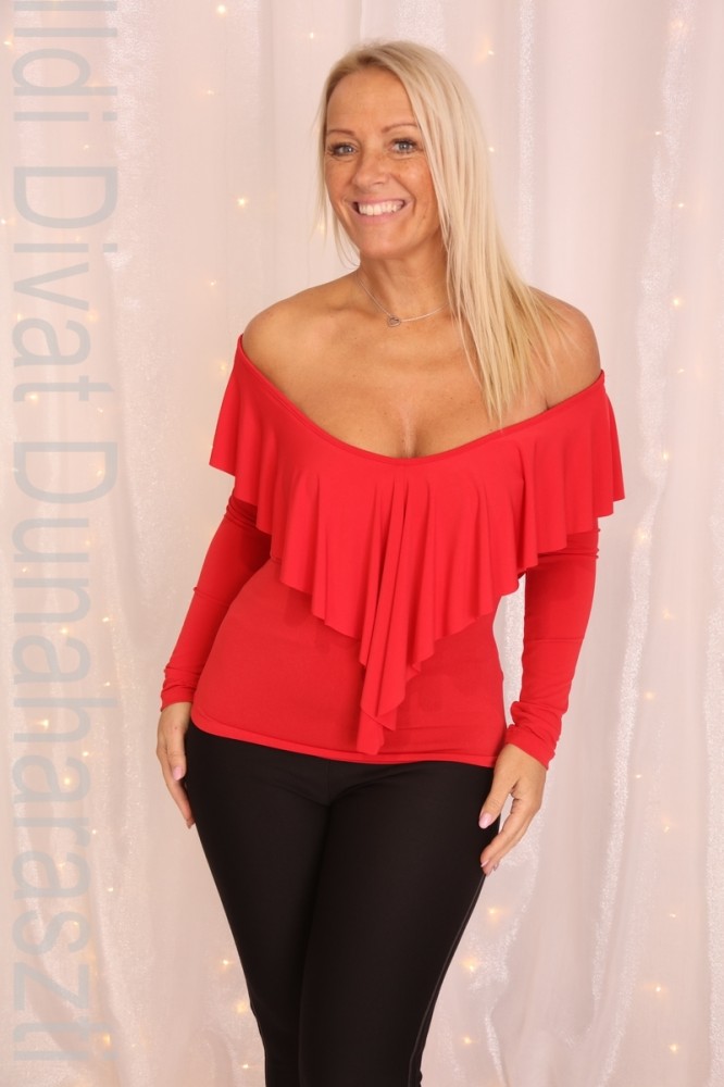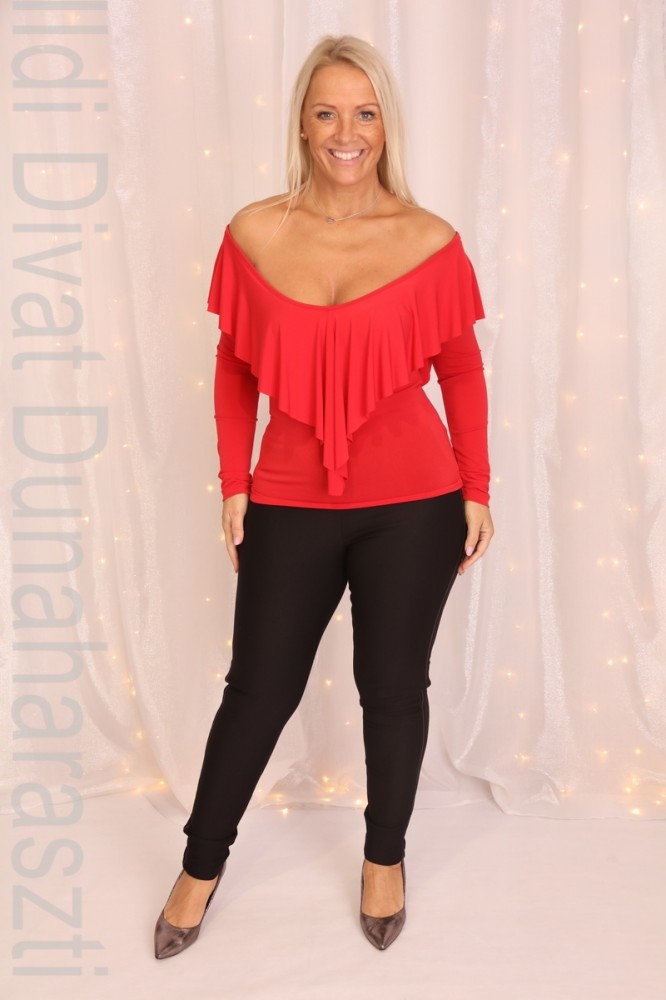 Kikiriki piros színű, vállra húzható, fodros, karcsúsított fazonú felső.
