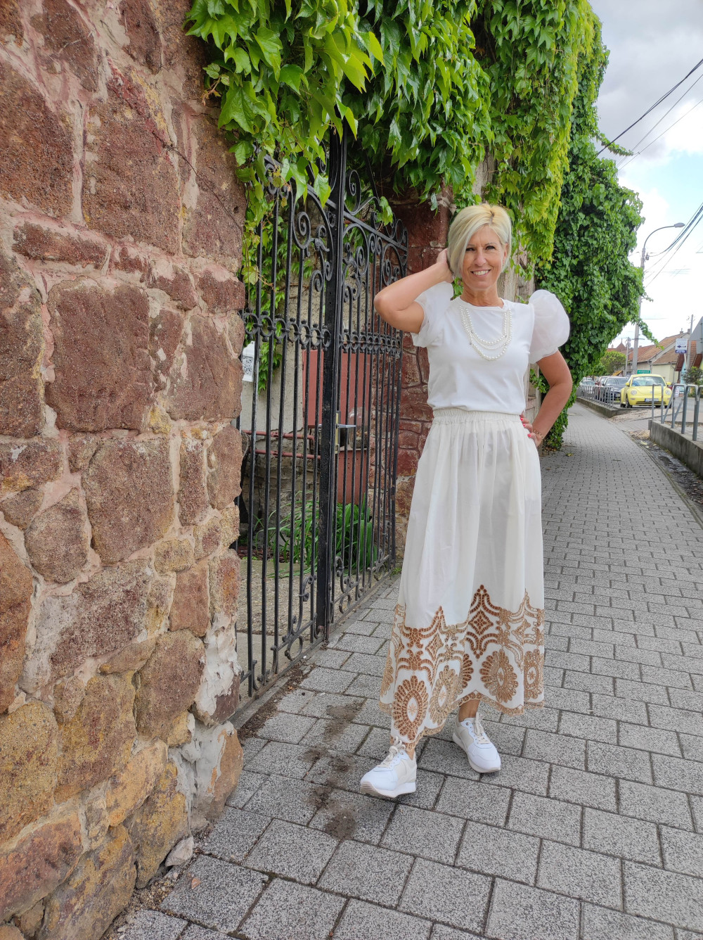 LGL Brand fehér színű, nyak gyöngy díszítéses, ujja buggyos és merev, muszlin anyagú, egyenes fazonú felső.