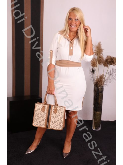La Luna fehér színű, barna betétes, V-kivágott, derekán kötős, felgombolt ujjú, egyenes fazonú ruha.