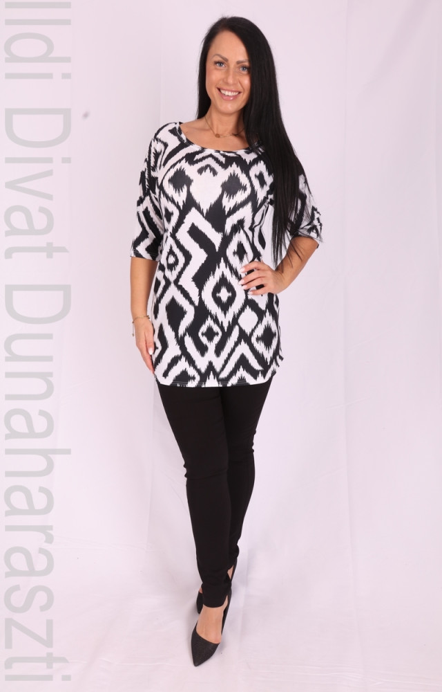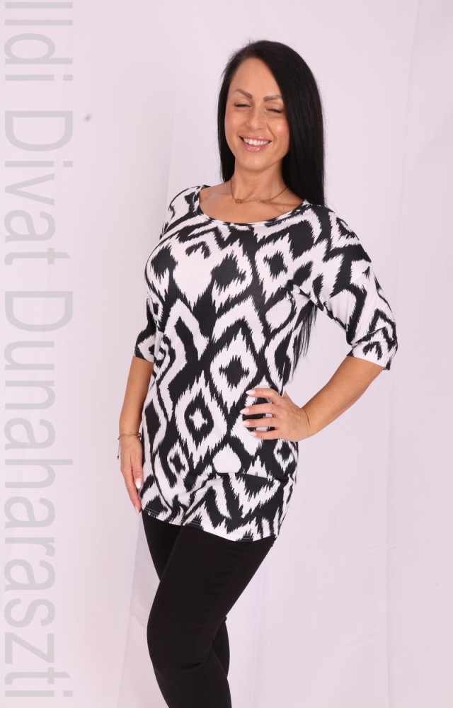 La Vita fekete-fehér mintás, kerek nyakú, ejtett vállú, karcsúsított fazonú tunika.