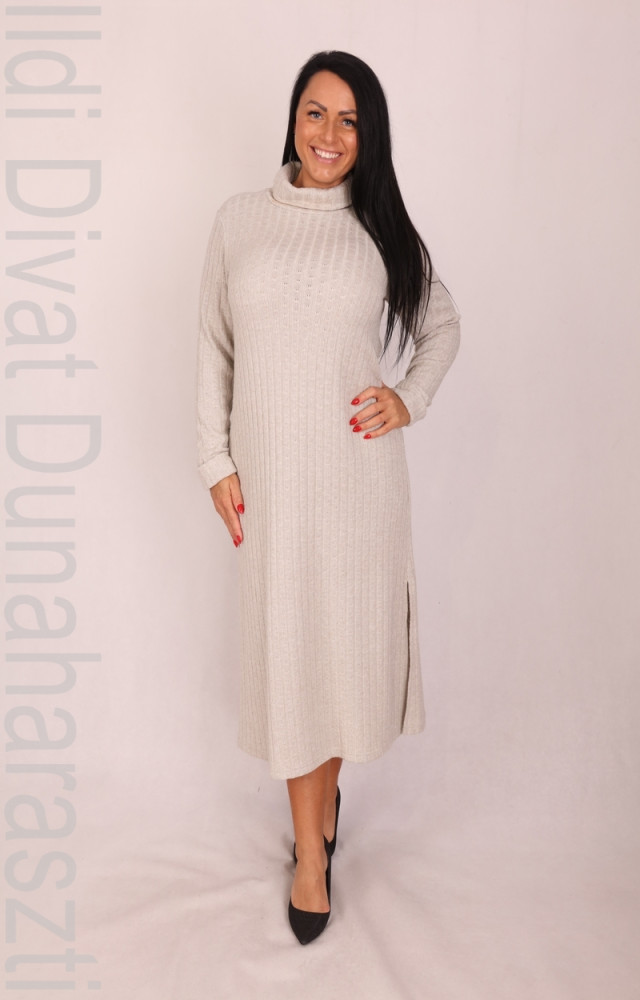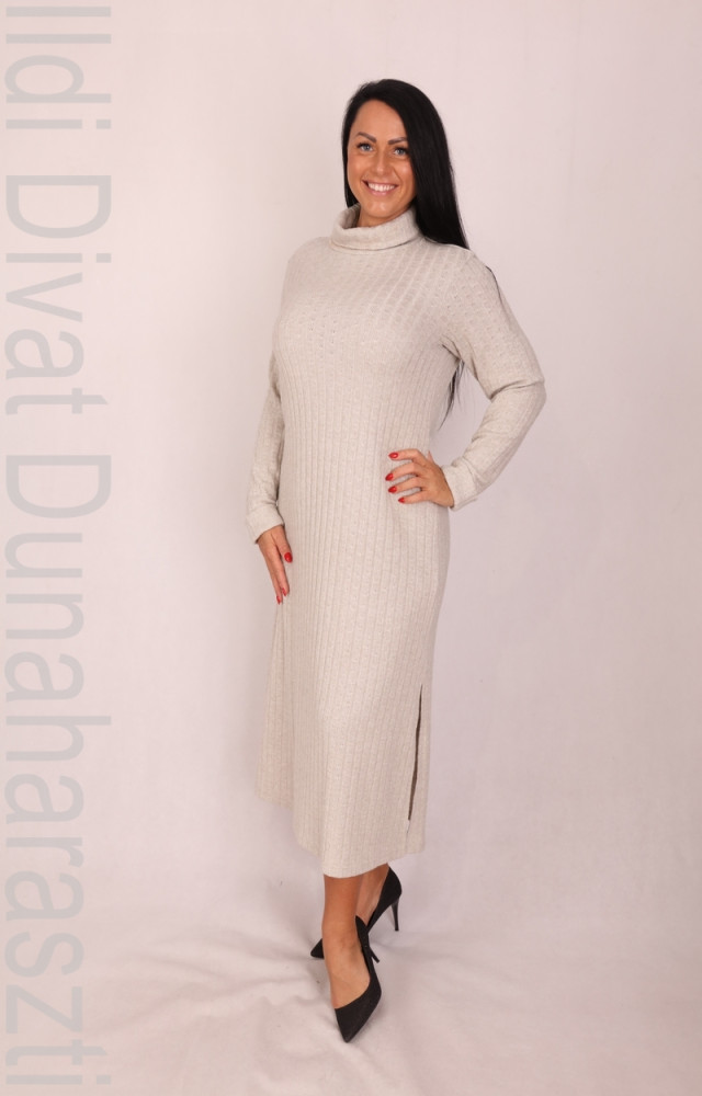 La Vita szürke színű, anyagában mintás, ezüst lurex szálas és kötött, garbós, ujja vége visszahajtott, alján féloldalt slicces, egyenes fazonú ruha.