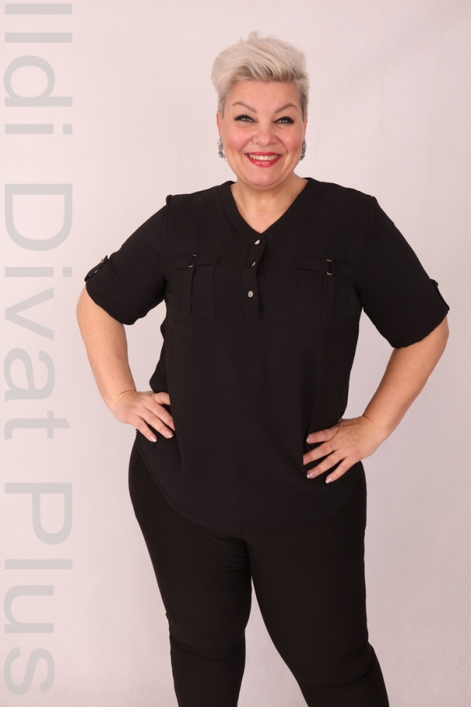 Lapex fekete színű, V-kivágott, mell résznél zsebes és gombos, lezser fazonú felső.