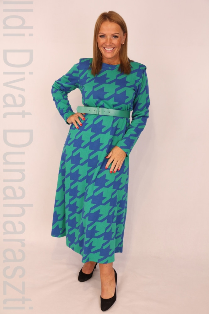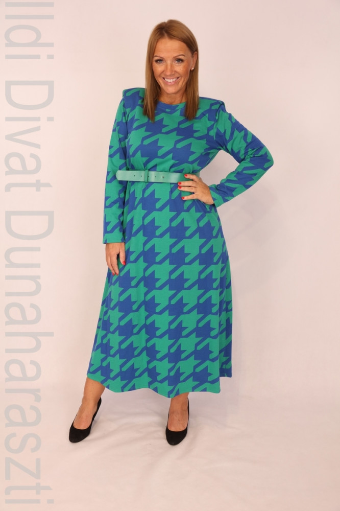 Limitált kollekciós, zöld-kék tyúklábmintás, gépi kötött anyagú, válltöméses, derekán öves, enyhén lefelé bővülő ruha.
