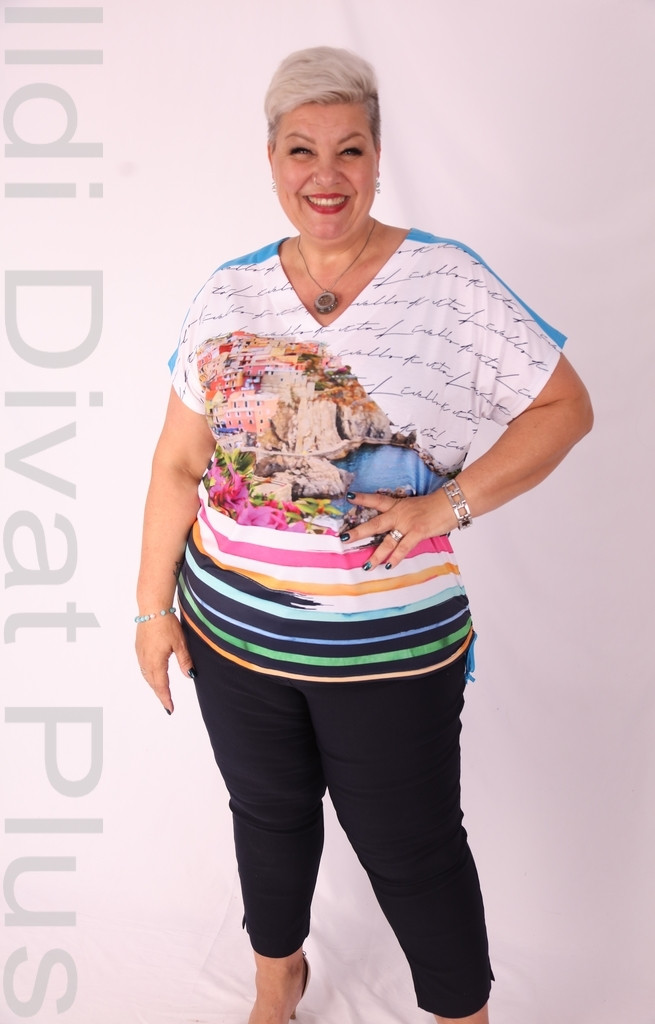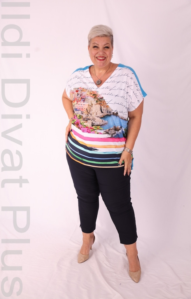 Livello Di Vita fehér alapon színes mintás írásos felső.