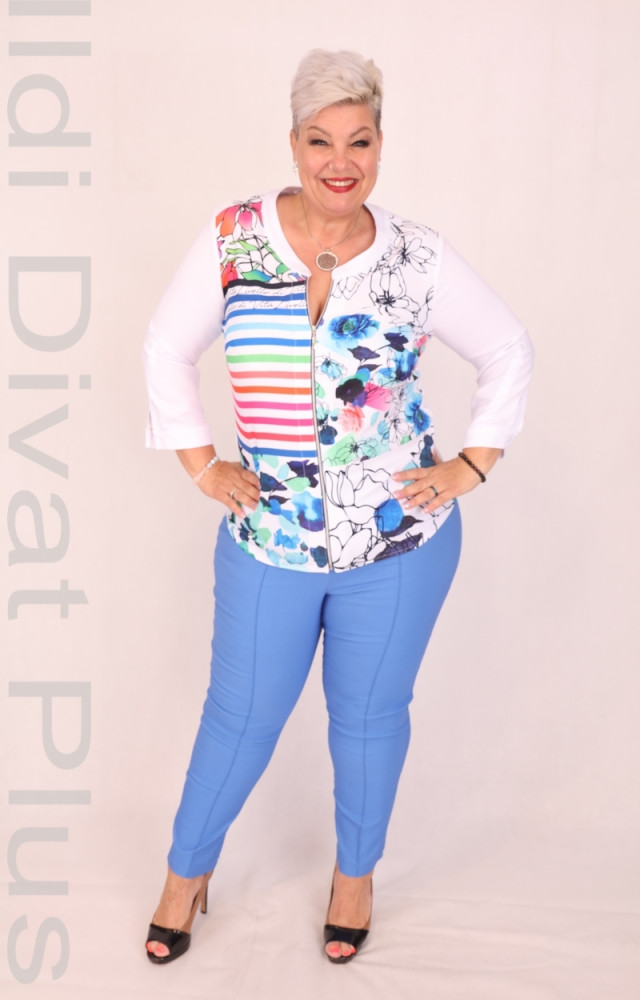 Fehér alapon virágmintás, cipzáras blúz.