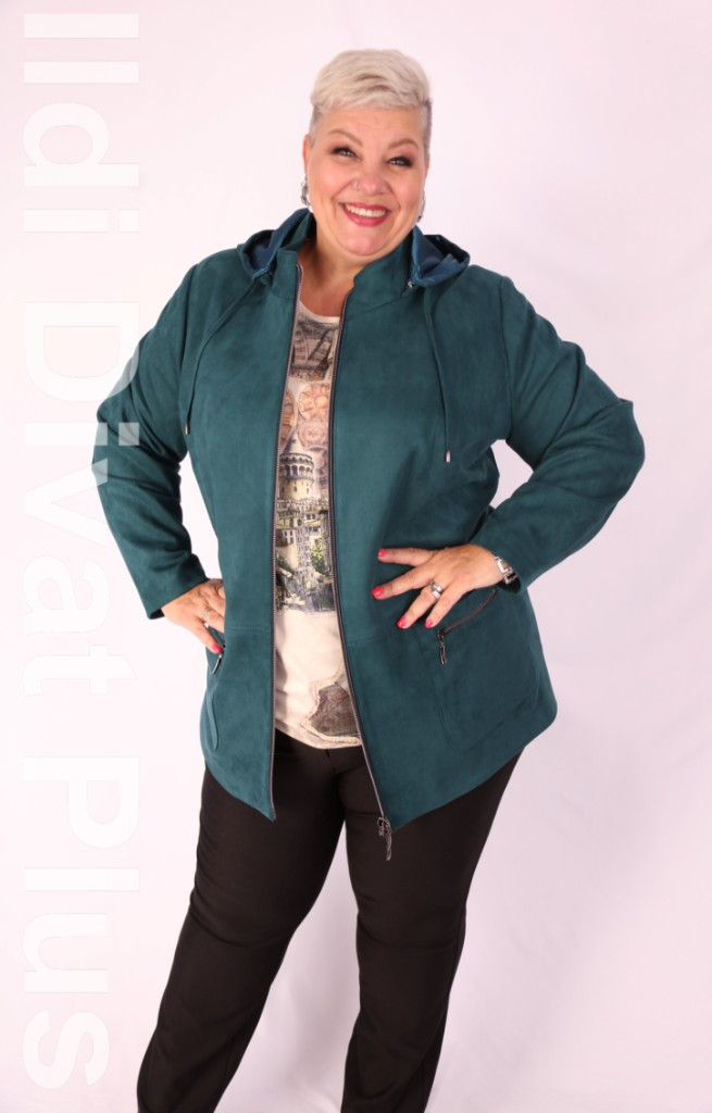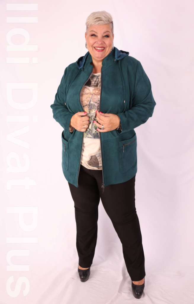 Livello Di Vita petrol színű, velúrbőr, kapucnis, kapucni belseje szatén anyagú , cipzáras, zsebes, egyenes fazonú kabát.