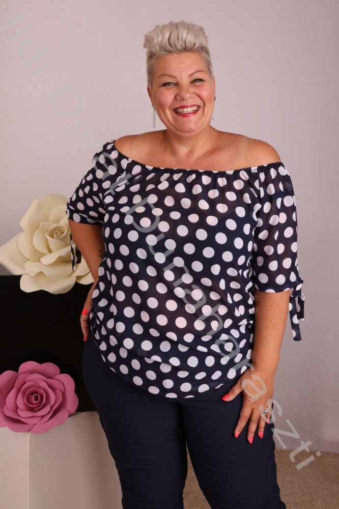 Livello sötétkék-fehér pöttyös, vállra húzható, ujján megkötős, lezser fazonú felső.
