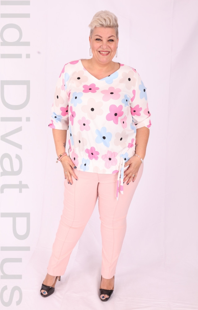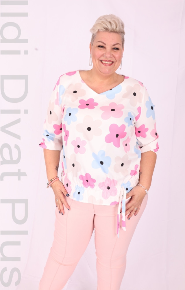 Luiza fehér alapon színes virágmintás, V-kivágott, alján megkötős, lezser fazonú felső.