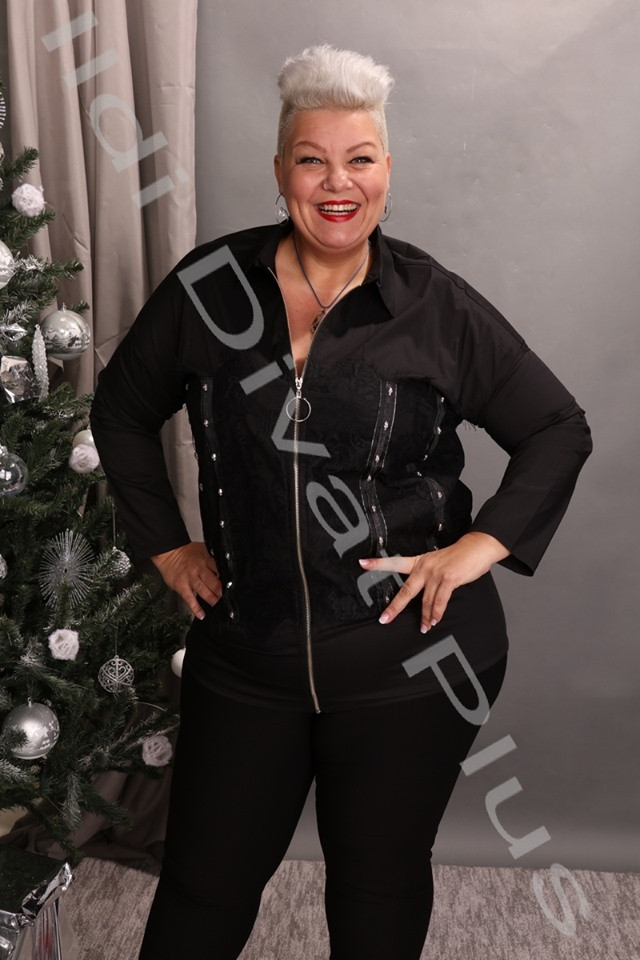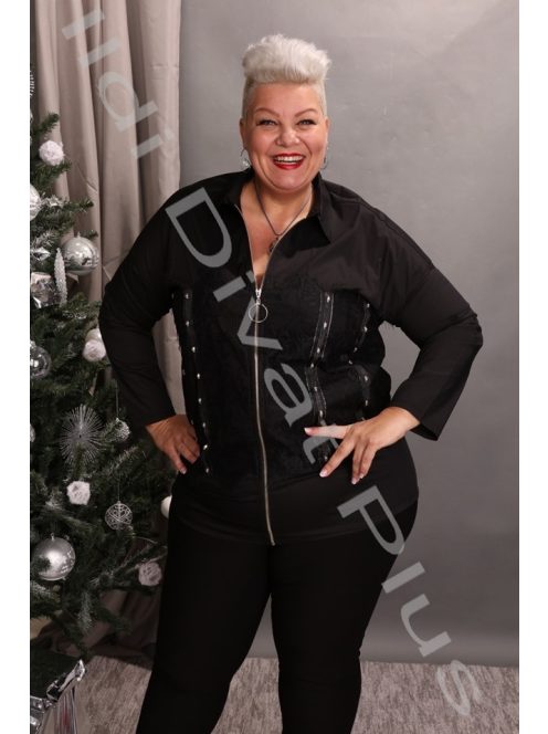 Luizza fekete színű, galléros, cipzáras, csipke betétes, karcsúsított fazonú felső.