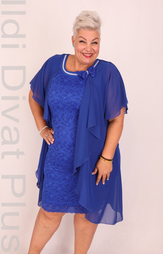 Lumia királykék színű, csipkés, nyak részén gyöngy díszítétes, muszlin rátétes, karcsúsított fazonú ruha.