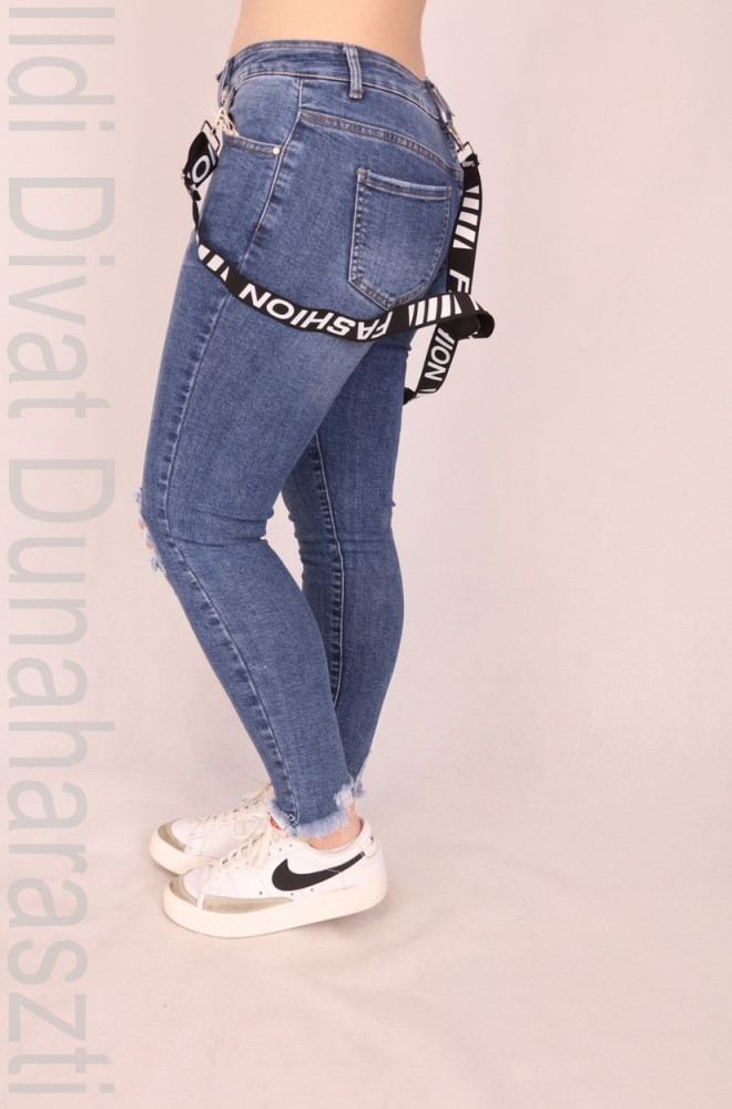 M.Sara farmerkék színű, elején és hátulján zsebes, levehető kantárral, elején és alján tépett, szűk szárú farmernadrág.