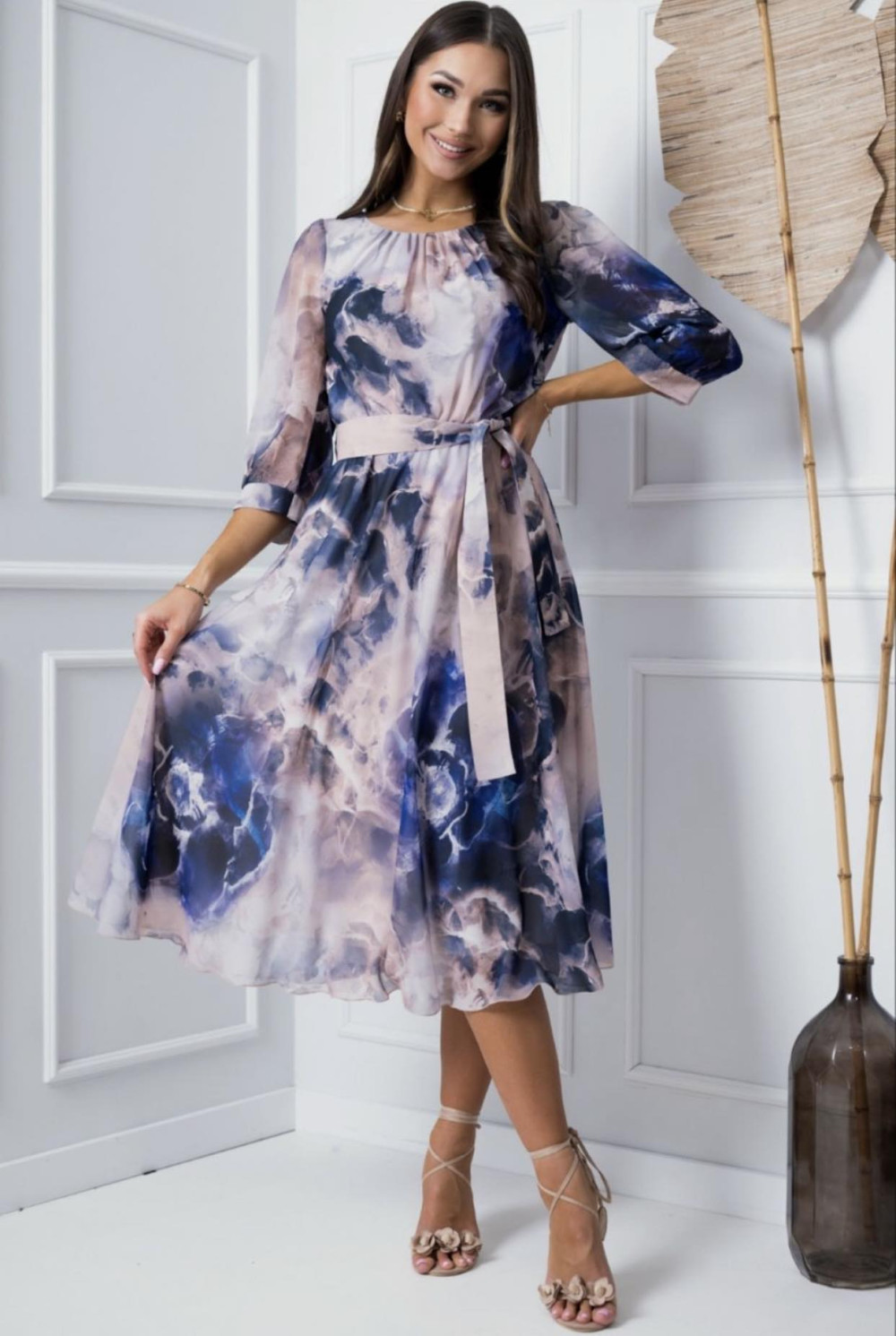 Margo lila mintás, kerek nyakú, derekán megkötős, muszlin, A-vonalú ruha.