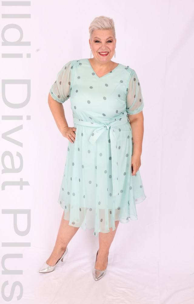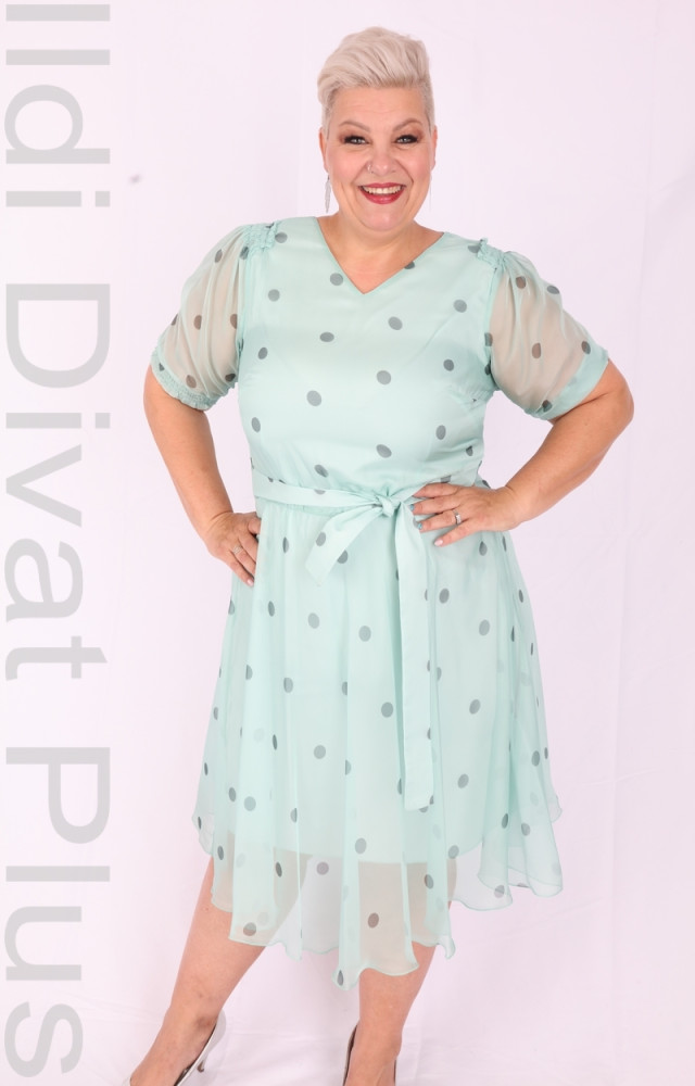 Margo menta alapon fekete pöttyös, V-kivágott, derekán megkötős, muszlin rátétes, A-vonalú ruha.