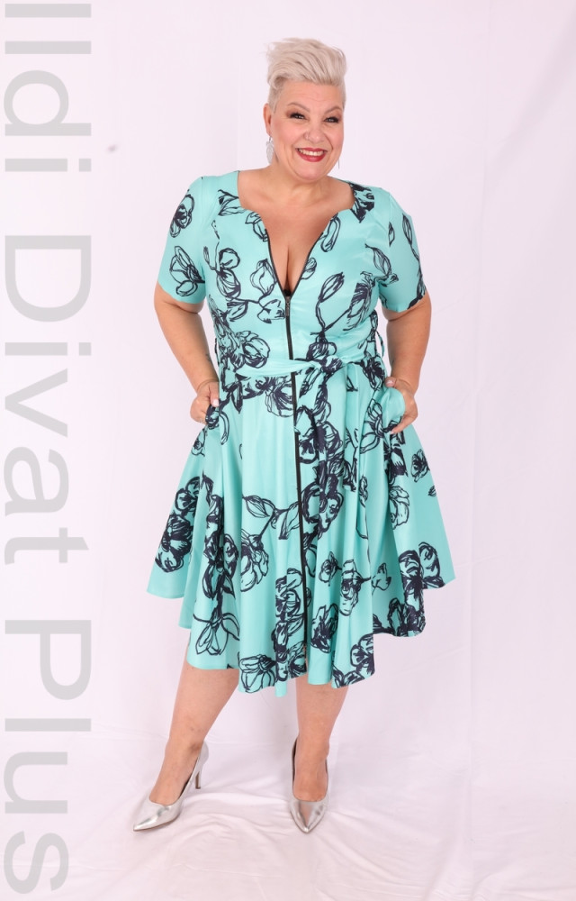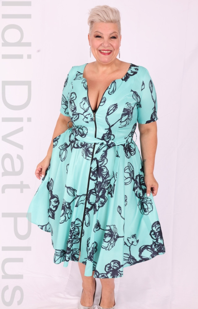 Margo menta-kék virágmintás, V-kivágott, elején cipzáras, derekán megkötős, A-vonalú alkalmi ruha.